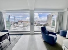 The property features three bedrooms, two bathrooms (one ensuite), and a spacious open-plan living room and kitchen. The living room opens to a large sunny terrace which is partially covered that takes you to a rooftop 50.43m2 solarium with panoramic views to the bay with plenty of space to enjoy the best weather in Europe.