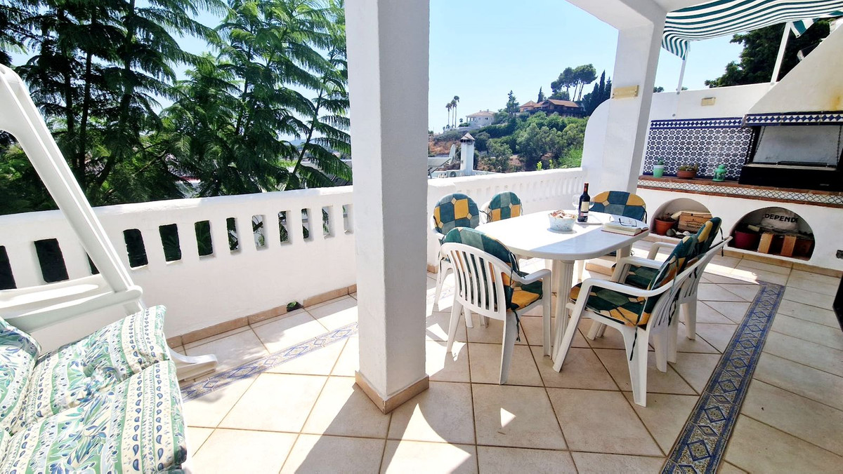 Partially renovated townhouse in Campo Mijas with panoramic views. Spread over 3 floors, it features 3 bedrooms, terraces on every level, a solarium, modern kitchen, and BBQ terrace. Community pool & gardens included. Peaceful location just 5 minutes from town!