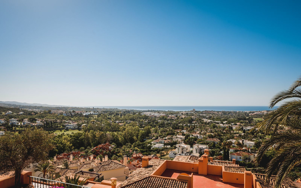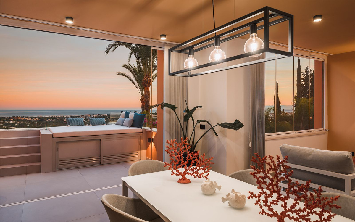Spectaculaire penthouse en duplex entièrement rénové avec vue panoramique imprenable sur la mer, les montagnes et la vallée du golf à Los Belvederes, une résidence fermée réputée de La Cerquilla, Nueva Andalucia, avec sécurité 24h/24, jardins communs arborés, piscine, 2 courts de tennis (actuellement en discussion pour convertir l'un d'eux en 2 courts de paddle) et une salle de sport avec sauna. La propriété occupe tout le dernier étage de l'immeuble et comprend une impressionnante entrée avec vestiaire et petite cave à vin, menant au salon/salle à manger avec vue panoramique sur la mer et accès à une terrasse couverte menant à une terrasse découverte avec bassin profond/jacuzzi ; une cuisine ouverte avec appareils électroménagers Neff haut de gamme ; et une chambre d'amis avec salle de bain attenante et dressing. À l'étage : une chambre principale double avec salle de bain attenante, cheminée, dressing et accès à une terrasse découverte avec stores électriques, bénéficiant des meilleures vues ; une chambre d'amis avec salle de bain attenante ; et une buanderie. Les autres caractéristiques comprennent : la technologie aérothermique Daikin ; Chauffage au sol (eau chaude) dans toute la maison ; système audio Sono dans toute la maison ; climatisation réversible avec régulateurs de zone. La propriété comprend une place de parking et