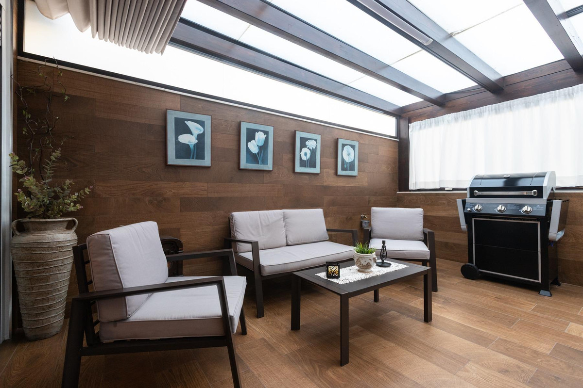 The master bedroom has access to the terrace, the bathroom is renovated, and there is another bedroom with a comfortable dressing room. The living room connects to a glazed terrace, perfect for year-round use; it even has air conditioning! And it comes with a garage and storage room included in the price.