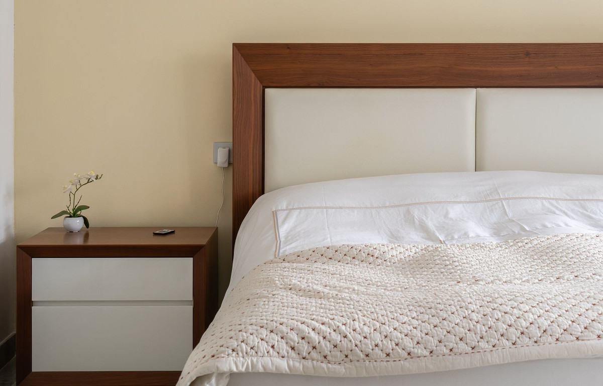 Au niveau inférieur, l'élégante suite parentale dispose d'un grand dressing et d'une luxueuse salle de bains avec baignoire et douche. Une partie du patio attenant a été clôturée pour créer un bureau pratique, idéal pour le télétravail. La chambre s'ouvre directement sur une terrasse et un jardin privés, avec accès aux espaces communs magnifiquement aménagés et à la piscine.