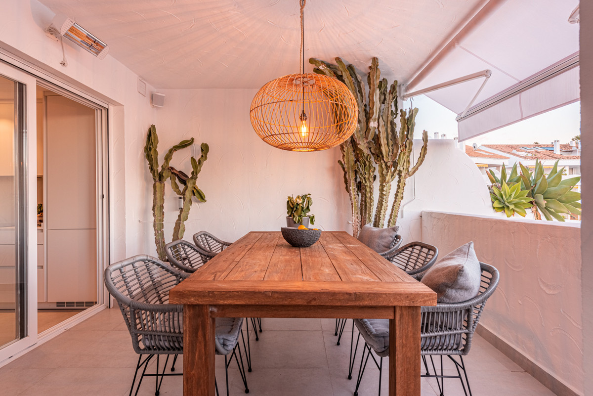 Located in the sought-after urbanization of El Dorado in Nueva Andalucia, this Duplex Penthouse is a symbol of luxury and convenience. Designed with modern Scandinavian elegance, the property spans two floors, featuring three bedrooms and three bathrooms. The ground level has a bright, open-plan kitchen with premium appliances, seamlessly merging into a living area that opens to a south-facing terrace. This space is complemented by a dining table, a bar table, and a BBQ area, overlooking the spacious community pool.