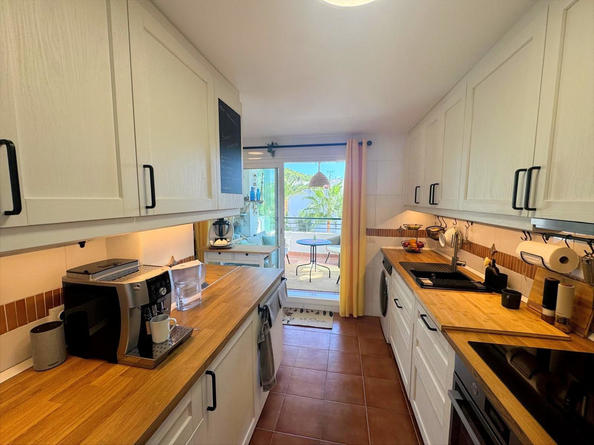 À votre gauche, une cuisine entièrement équipée et récemment rénovée vous offre des prestations modernes, notamment un chauffe-eau neuf. De là, accédez à une charmante terrasse couverte : un havre de paix pour savourer un café matinal sous un soleil radieux, avec une vue imprenable sur la végétation luxuriante et les fairways du golf d’Alhaurín. À l’abri des fortes chaleurs de l’après-midi, c’est aussi un refuge idéal pour se détendre en été.