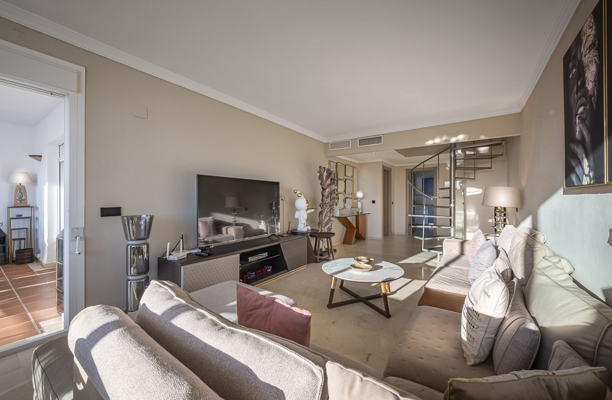 Bienvenue à Marbella. Imaginez-vous vous réveiller chaque matin, le visage caressé par la douce brise méditerranéenne, avec la promesse d'une nouvelle journée dans l'un des quartiers les plus exclusifs au monde. Ce luxueux duplex, situé au cœur vibrant de Puerto Banús, est bien plus qu'une simple propriété : c'est un havre d'élégance, de sérénité et de style. Dès que vous franchirez le seuil, vous serez conquis par le décor exquis, où chaque détail a été soigneusement choisi pour créer une expérience visuelle et sensorielle unique. Les pièces spacieuses et lumineuses s'ouvrent naturellement sur l'extérieur, laissant la lumière du sud inonder chaque recoin. Au rez-de-chaussée, la cuisine séparée, entièrement équipée, est un espace idéal pour savourer de délicieux repas et partager des moments privilégiés. Attenant, le salon offre une atmosphère de confort absolu, parfaite pour se détendre après une journée passée à profiter des charmes de Marbella. À ce même niveau, deux chambres garantissent repos et intimité : • Une suite parentale avec un lit king-size, une salle de bains privative et un balcon vitré intime où règnent calme et sérénité. • Une deuxième chambre avec deux lits simples et une salle de bains complète, conçue pour le confort d'une famille ou d'un couple. En gravissant l'élégant escalier, vous découvrirez le véritable trésor de la propriété : une spacieuse suite parentale avec accès direct à la terrasse supérieure. De là, la vue sur la mer offre un spectacle changeant qui accompagne chaque lever et chaque coucher de soleil.