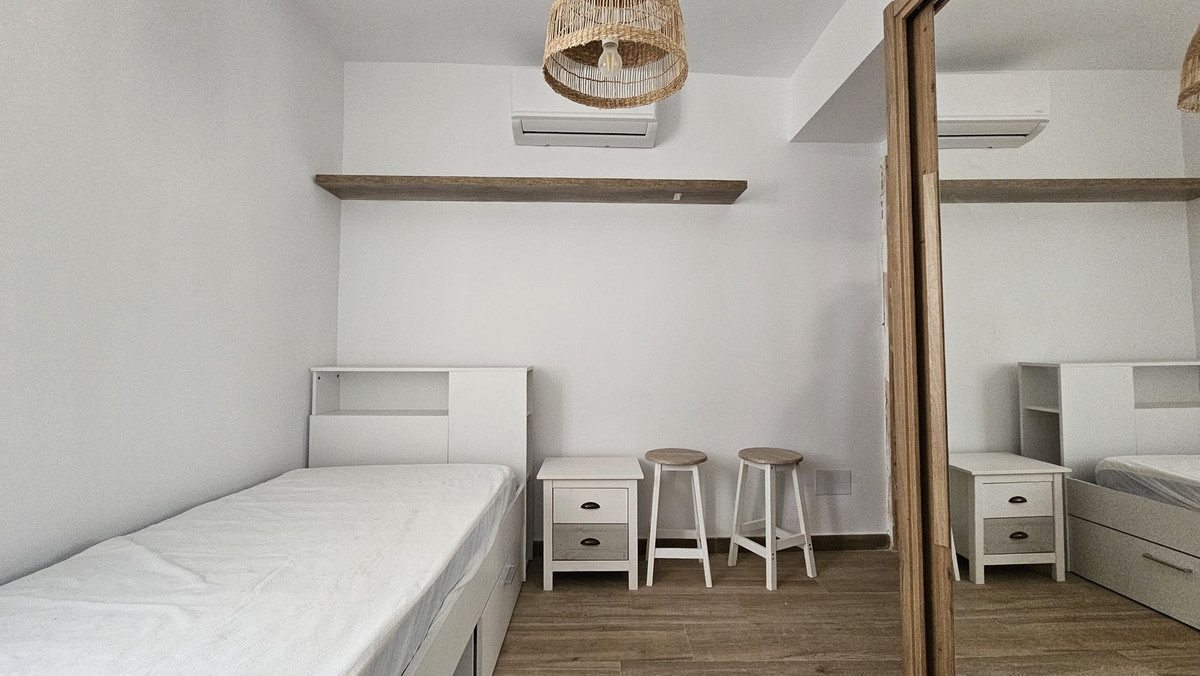 Une autre salle de bain entièrement équipée se trouve dans le couloir, partagée par les deux autres chambres. L'une peut accueillir un lit double et dispose de placards intégrés, tandis que l'autre, plus petite, peut être aménagée en chambre avec un lit simple ou en bureau/espace de rangement.