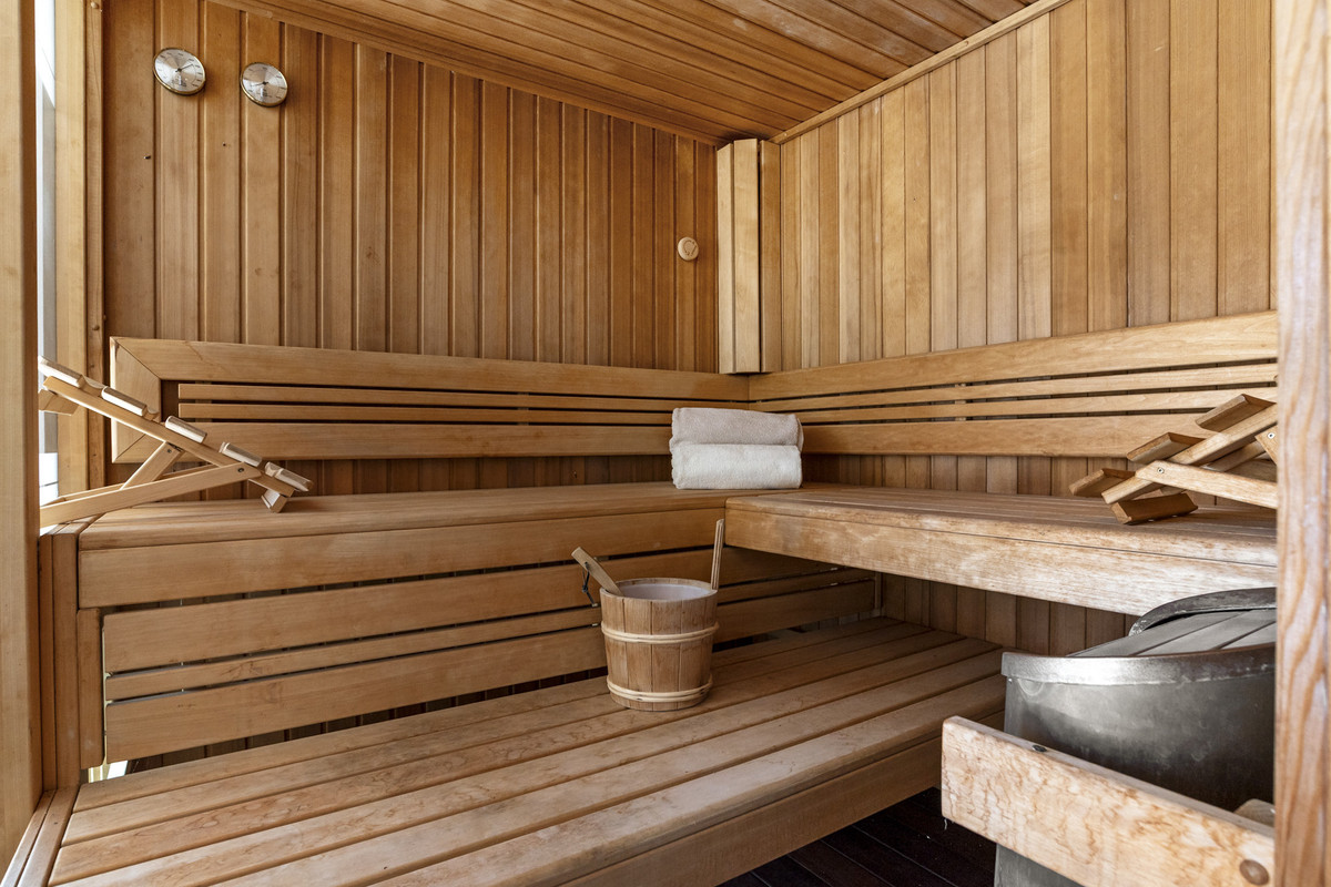 L'espace bien-être comprend une salle de sport privée, un sauna, un jacuzzi intégré au sol et une salle de bain complète, créant un espace idéal pour la détente et le bien-être.