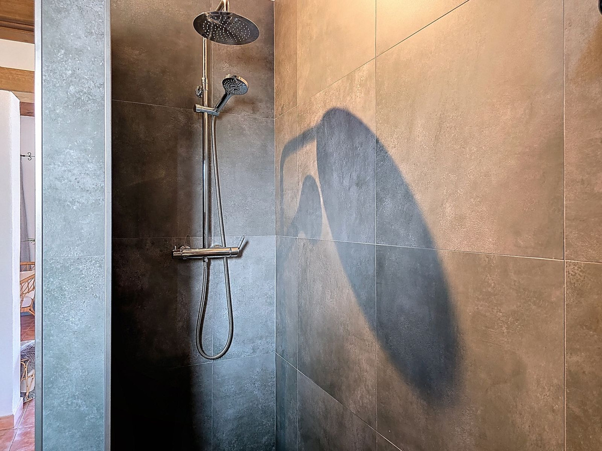 La propriété comprend trois chambres doubles spacieuses, chacune dotée de rangements intégrés et offrant une vue sur la campagne environnante. L'une des chambres bénéficie d'une salle de bains privative, pour plus d'intimité et de confort. Une seconde salle de bains familiale, ornée de carreaux andalous traditionnels et d'équipements modernes, offre un espace lumineux et fonctionnel, aussi bien pour les résidents que pour leurs invités.