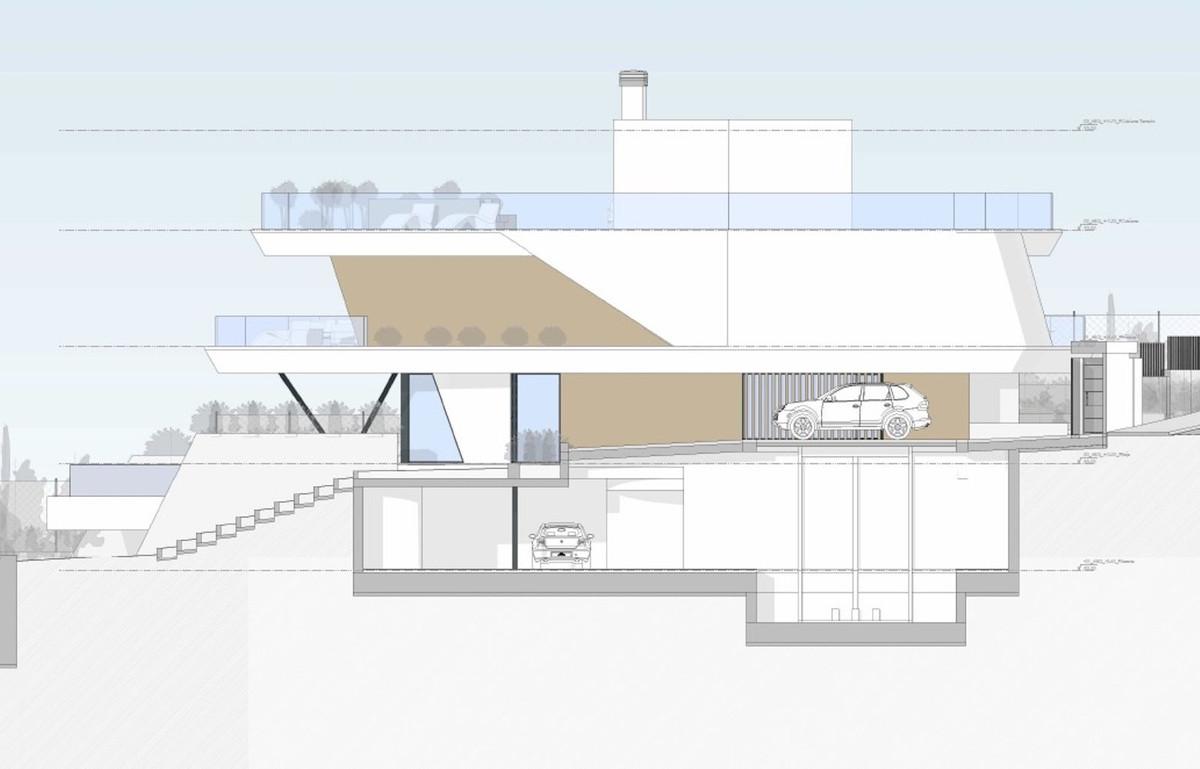 Ce projet est une villa individuelle de style méditerranéen moderne, répartie sur quatre niveaux adaptés à la pente du terrain. Elle comprend un garage en sous-sol, un séjour/cuisine ouverte au rez-de-chaussée, trois chambres à l'étage et un solarium sur le toit avec jacuzzi. Elle est entièrement conforme au règlement d'urbanisme de la commune de Mijas, notamment en ce qui concerne la surface constructible maximale (0,50 m²/m²), la hauteur, le nombre d'occupants et le retrait minimal de 3,00 m.