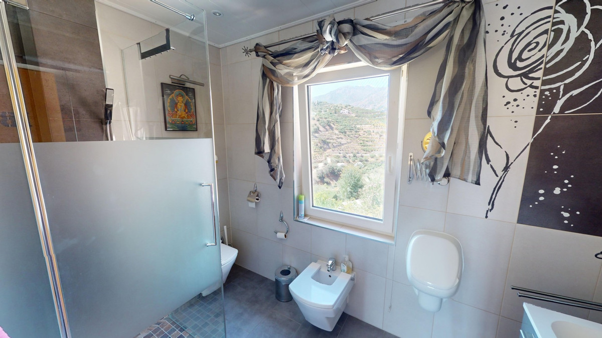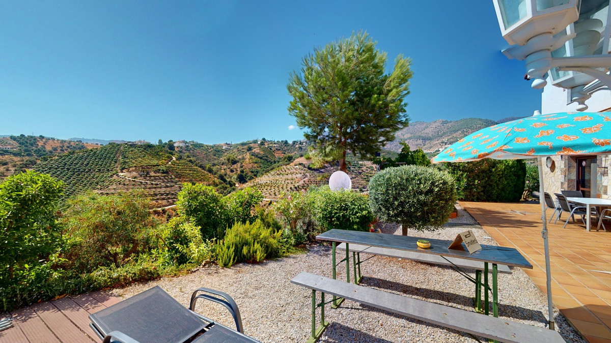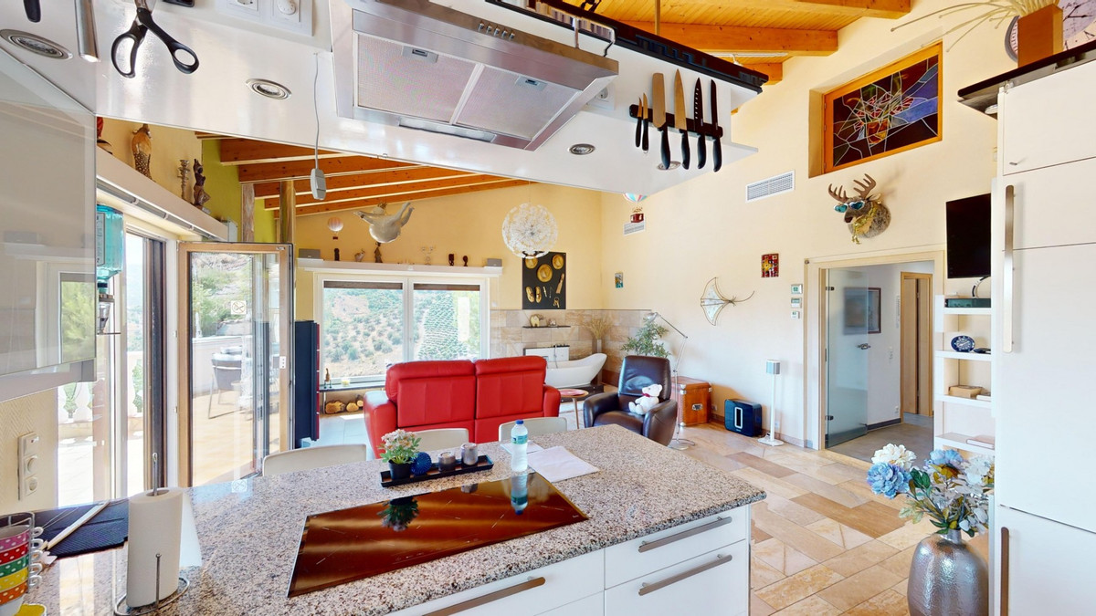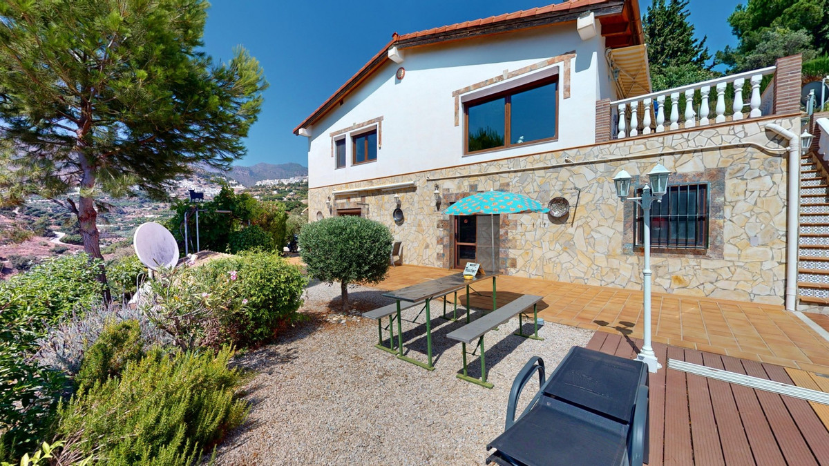 Magnifique villa à vendre au pied de Frigiliana. Cette impressionnante villa, nichée au pied de Frigiliana, offre deux logements indépendants sur deux niveaux, chacun avec son propre accès et son intimité. Le logement supérieur, d'une superficie de 150 m², comprend un vaste espace de vie ouvert avec cuisine attenante et rangements pratiques. La terrasse offre une vue imprenable sur les montagnes environnantes. Le salon se distingue par sa cheminée pivotante, qui apporte chaleur et ambiance. La terrasse abrite également une salle de fitness. Autre atout : la luxueuse baignoire du salon, idéale pour se détendre. Ce logement comprend trois chambres spacieuses, deux salles de bains (dont une attenante à la chambre principale) et des toilettes invités. Le logement inférieur, d'une superficie totale de 80 m², comprend un espace de vie convivial avec cuisine, une chambre et une salle de bains. L'ensemble de la maison est équipé d'un chauffage au sol, de la climatisation et d'un système d'aspiration centralisée. Construite selon les normes allemandes les plus exigeantes, elle bénéficie d'une excellente isolation et de matériaux de haute qualité. Un système de panneaux solaires sur le toit assure le chauffage et l'eau chaude sanitaire. L'espace extérieur de cette villa d'exception est tout simplement parfait. Vous y trouverez une piscine d'eau salée chauffée avec une couverture facile à manipuler, un jacuzzi relaxant et une cuisine d'été entièrement équipée avec sauna. De plus, un atelier, une caravane et une petite dépendance se situent au pied de la propriété. Le terrain de 6 000 m² est agrémenté de nombreux arbres fruitiers, une véritable invitation à la flânerie pour les amoureux de la nature. La villa bénéficie d'une excellente desserte et est idéale pour ceux qui apprécient une vie paisible en pleine nature. Vivez une expérience luxueuse dans un cadre à couper le souffle : votre nouvelle demeure au pied de Frigiliana vous attend ! Nous serons ravis de vous présenter prochainement cette propriété de rêve, en personne ou par visite virtuelle. Car ce monde est unique, à l'image de notre Axarquía. En Andalousie. Sur la Costa del Sol. Ici, sous le soleil…