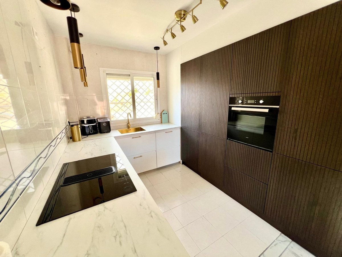 Maison de ville à Torrequebrada, Benalmádena. Accès direct depuis la maison à un garage privé pour deux voitures. Piscine chauffée privée et terrasses + jardin/patio supplémentaire (emplacement en angle). Piscine équipée d'un moteur, de canalisations et d'un système de chauffage réversible neufs.