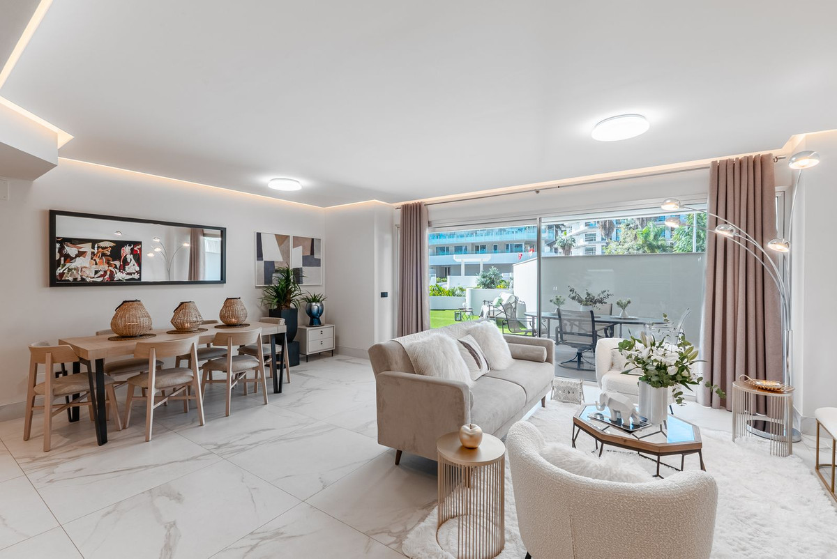 This elegant 2-bedroom, 2-bathroom ground-floor apartment is located in one of the most desirable areas of the Costa del Sol, just steps from the beach and all essential amenities. Designed for comfort, style, and convenience, this home offers a perfect blend of indoor and outdoor living thanks to its spacious private garden and generous covered terrace.