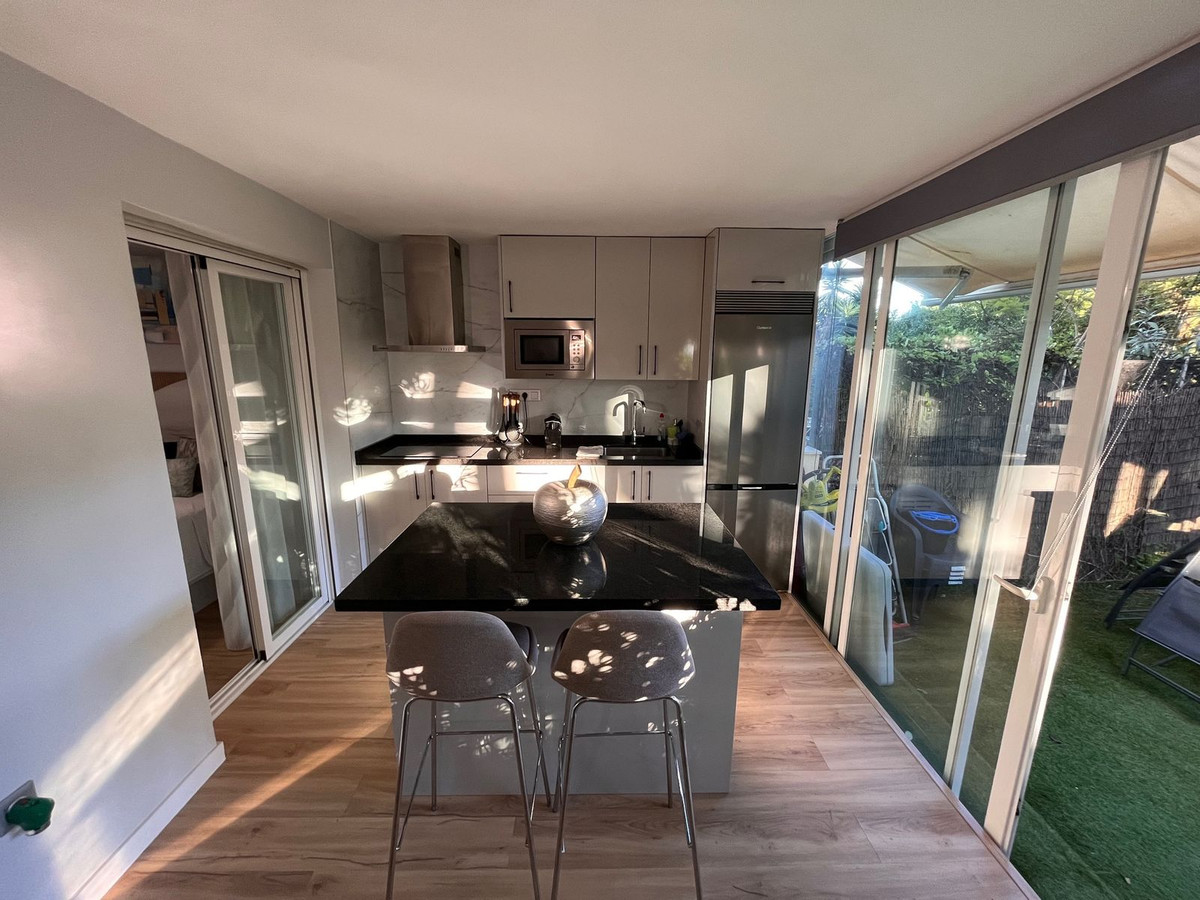 À l'intérieur, l'appartement a été rénové avec des matériaux de haute qualité et un design moderne qui met en valeur la luminosité et l'impression d'espace. Il comprend deux chambres, une salle de bains entièrement équipée, une cuisine fonctionnelle et un vaste séjour donnant directement sur le jardin.