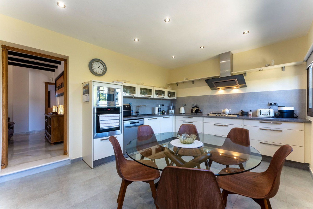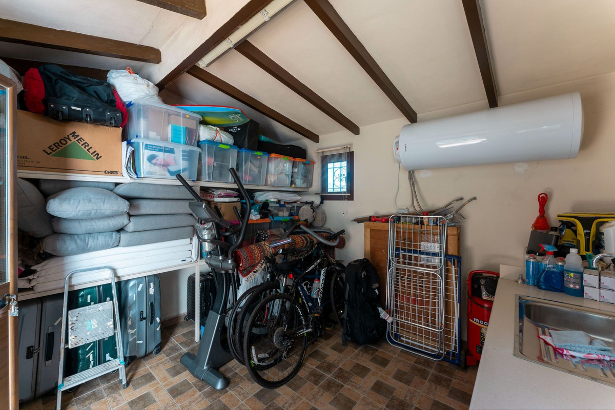 From the living room, sliding doors open onto a glazed terrace, ideal for year-round use, leading directly to the private swimming pool and beautifully maintained garden surrounded by mature vegetation. The plot also includes a utility room, storage hut for garden equipment, and a selection of fruit trees.
