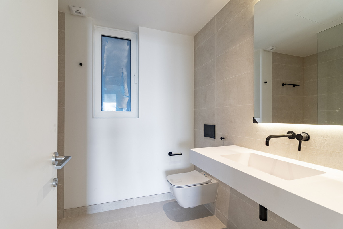 The spacious open-plan living and dining area seamlessly integrates with the modern, fully equipped kitchen, creating a bright and functional space that connects directly to the terrace. The design harmoniously blends indoor and outdoor spaces, offering an authentic Mediterranean experience.
