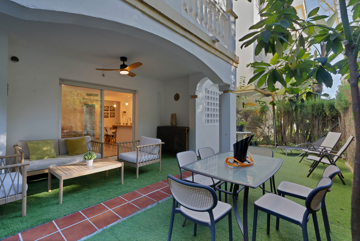 Nous vous présentons cette magnifique propriété située dans l'un des quartiers les plus prisés et prestigieux de Marbella : l'emblématique Golden Mile, un lieu où luxe, confort et qualité de vie se conjuguent harmonieusement. À seulement 800 mètres de la plage, vous profiterez de la Méditerranée en seulement 10 minutes à pied. La propriété est entourée de tous les services essentiels et haut de gamme : supermarchés, restaurants, écoles nationales et internationales, instituts, pharmacies, arrêts de bus, ainsi que les hôtels emblématiques Marbella Club et Puente Romano. Un emplacement privilégié qui vous permettra de rejoindre le centre-ville à pied et de profiter pleinement du quotidien. L'accessibilité est excellente : à 5 minutes en voiture de Puerto Banús, à la même distance du centre-ville et de la vieille ville de Marbella, et avec un accès direct à l'autoroute. L'aéroport de Malaga est à seulement 35 minutes. Située dans une résidence sécurisée construite en 2002, cette propriété offre sécurité, jardins soignés, piscine commune et terrain de paddle, faisant de ce logement un véritable bijou pour ceux qui recherchent confort, style et qualité. Cet appartement de plain-pied, exposé ouest, est idéal pour profiter du soleil de l'après-midi et dispose d'une charmante véranda de 20 m² et d'un jardin privatif, garantissant intimité et atmosphère chaleureuse. La surface habitable totale de 117 m² se compose comme suit : un vaste séjour/salle à manger baigné de lumière naturelle, une cuisine américaine moderne entièrement rénovée en 2023, deux chambres et deux salles de bains complètes, ainsi qu'un jardin privatif, idéal pour se détendre ou recevoir. De plus, une place de parking souterrain avec accès direct à l'appartement par ascenseur offre un confort optimal. L'appartement est équipé de la climatisation et du chauffage et est adapté aux personnes à mobilité réduite. Une opportunité unique grâce à son emplacement privilégié sur le Golden Mile. Parfait comme investissement, résidence secondaire ou résidence principale. Forte rentabilité locative grâce à une demande soutenue dans le secteur tout au long de l'année. Idéal pour ceux qui souhaitent améliorer leur qualité de vie ou investir dans l'un des quartiers les plus prometteurs de la Costa del Sol. Une propriété au charme méditerranéen, où le confort moderne rencontre l'exclusivité de Marbella. Le document d'information abrégé est disponible. Frais : Taxes (ITP ou TVA + AJD) + Frais de notaire et d'enregistrement foncier. BRF