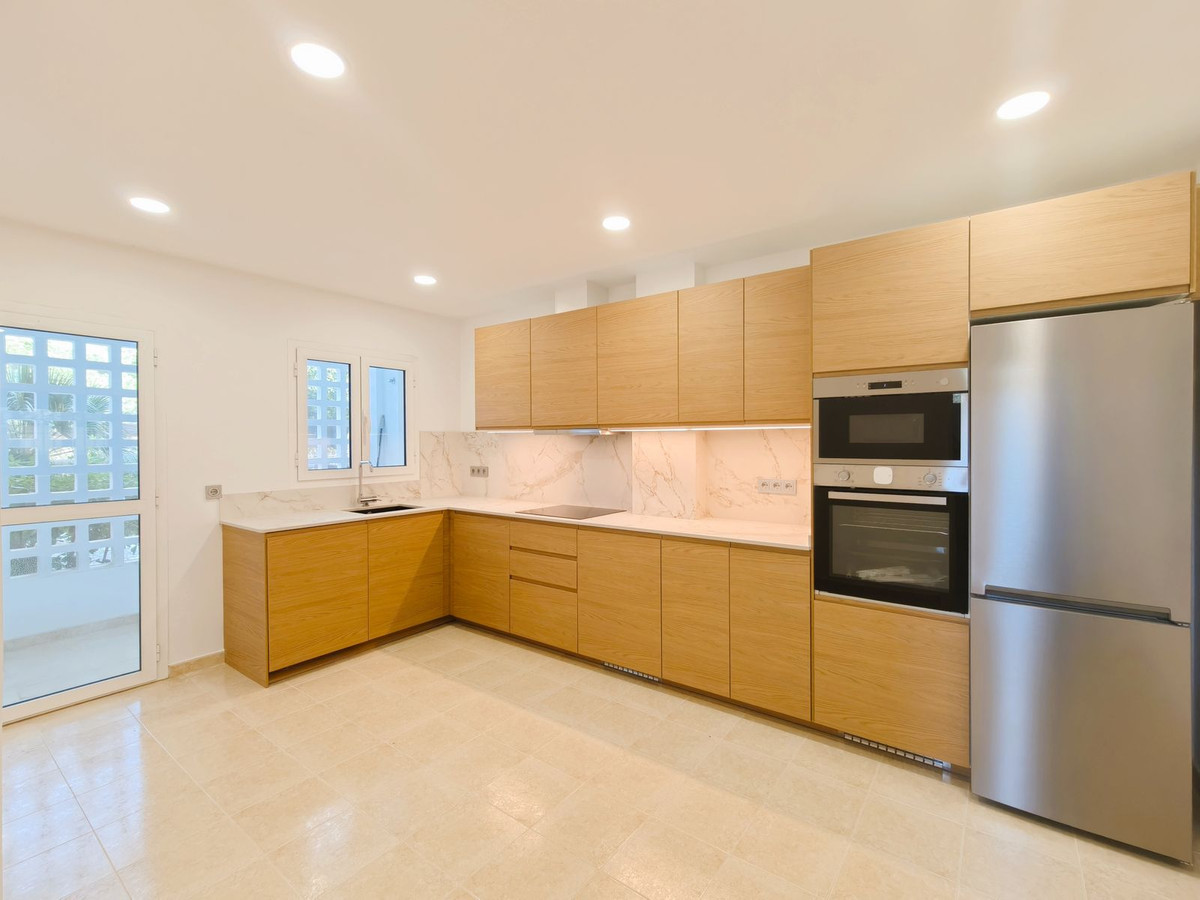 Cette propriété comprend un salon lumineux et spacieux avec une cheminée chaleureuse et un coin repas, relié harmonieusement à une grande cuisine entièrement équipée et récemment rénovée par une large ouverture qui accentue la sensation d'espace et de luminosité. Le salon donne directement sur un jardin privatif.