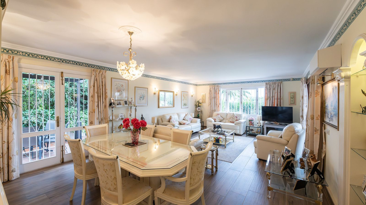 Le vaste séjour-salle à manger, avec ses larges fenêtres, s'ouvre sur une magnifique véranda couverte offrant une vue imprenable sur le jardin et la piscine, créant un espace idéal pour se détendre ou partager des moments en famille.