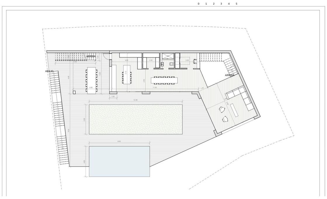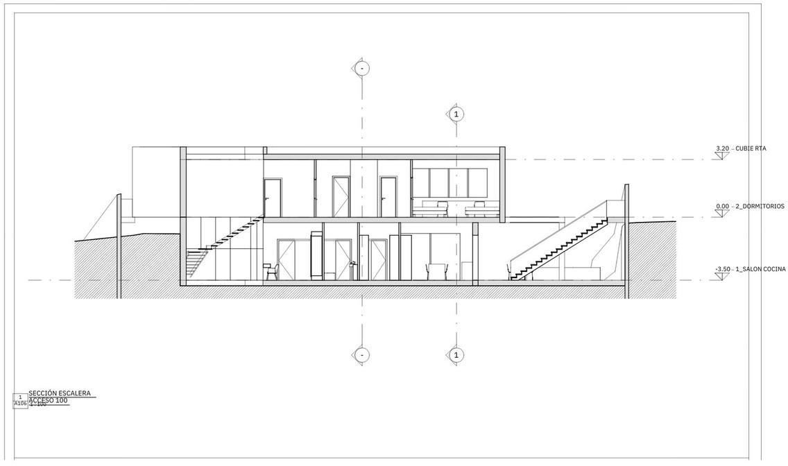 Rez-de-chaussée/Niveau d'accès (Espace de vie) : Salon, cuisine/salle à manger, toilettes, patio intérieur et bureau.