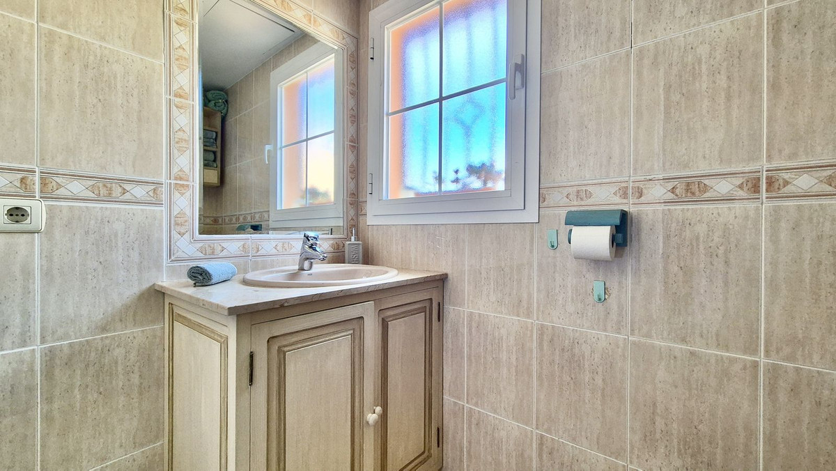 La chambre principale dispose d'une salle de bains privative et d'un accès direct à la terrasse, offrant un havre de paix baigné de lumière naturelle. La seconde chambre, tout aussi confortable, est complétée par une salle de bains pour les invités bien équipée.