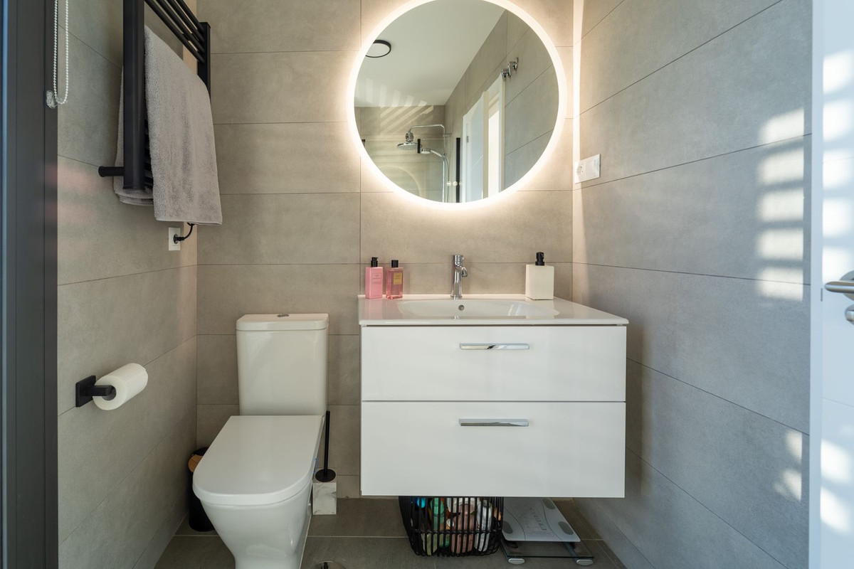 À l'étage, le premier niveau abrite la chambre principale, impressionnante, avec placards intégrés, store électrique, salle de bains attenante et vue sur la mer depuis le lit. On y trouve également deux autres chambres doubles et une salle de bains.
