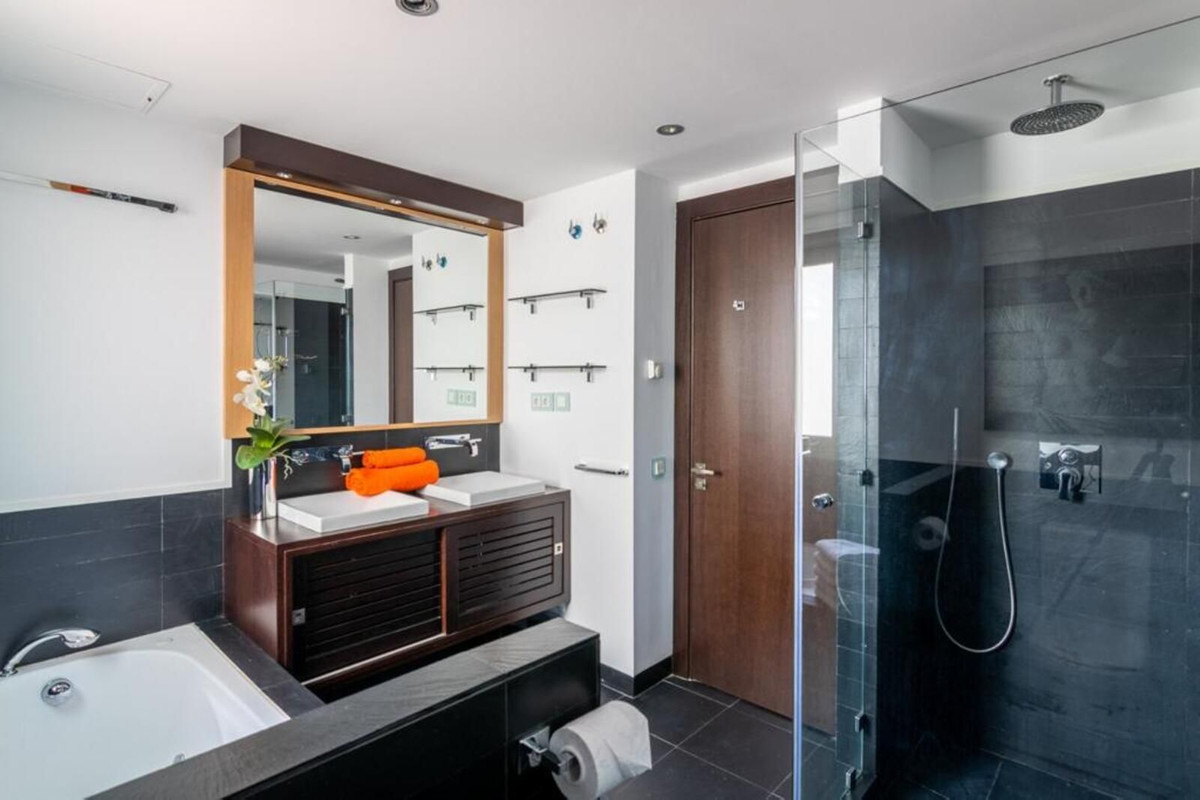 The apartment features two bedrooms with ensuite bathrooms, including the master bedroom. The third bedroom is served by a separate full bathroom, which also functions as a guest toilet. Sold fully furnished.