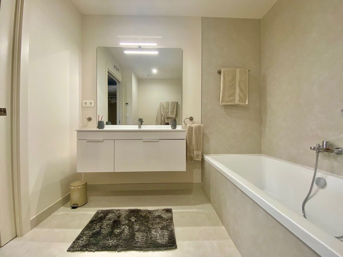 The open-concept kitchen is fully equipped with high-efficiency appliances (Bosch) and an advanced aerothermia climate system, blending sustainability with style. It connects harmoniously to a bright and airy living-dining area, both designed to maximise natural light and indoor-outdoor living. The master suite enjoys direct terrace access and a spa-inspired bathroom with walk-in shower and bathtub, while the second bedroom features fitted wardrobes and its own private terrace. UF heating in both bathrooms adds an extra touch of everyday luxury.