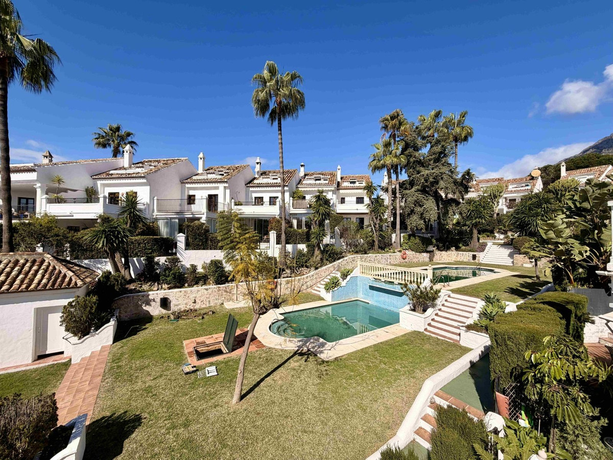 Exclusive townhouse in a gated Andalucian style community with two pools, lush mature gardens and excellent location in Nagueles, above the Golden Mile of Marbella.