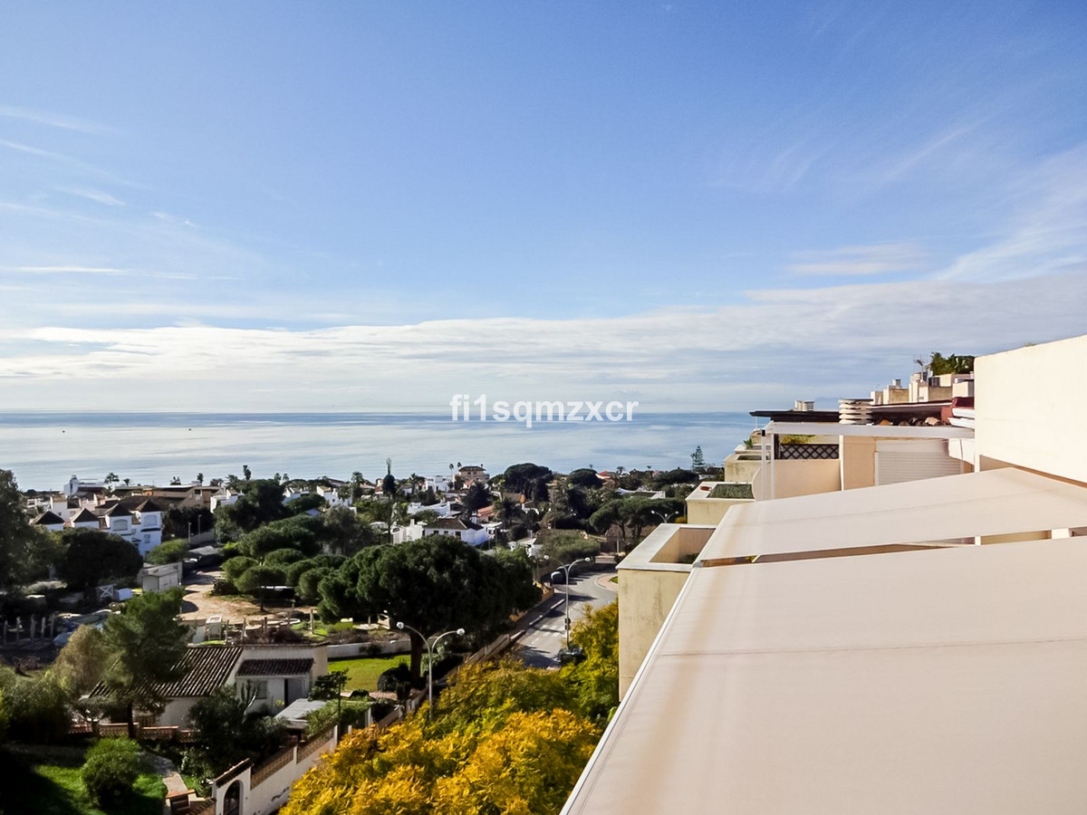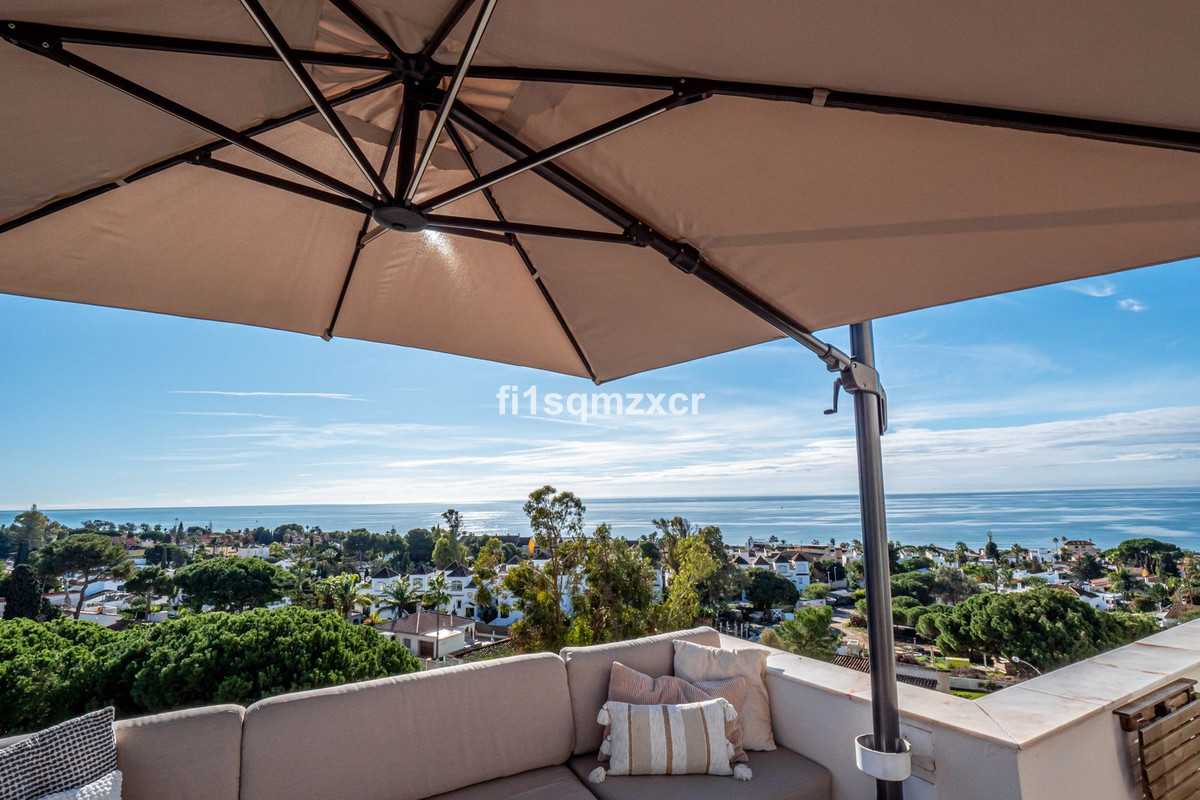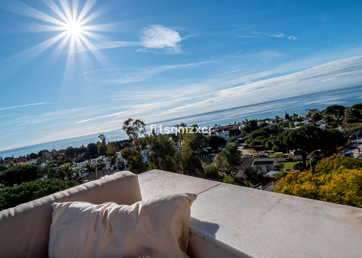 This unique corner penthouse with extraordinary views is located just a few minutes' walk from one of Marbella's most beautiful beaches, home to the best beach clubs, chiringuitos, and beach restaurants. The property has been completely redesigned and modernized with the finest materials. From the entire property, you have spectacular views of the entire coastline, Africa, and the mountains. Fourth floor: Hallway/entrance with stairs to the upper floor, guest toilet, new modern kitchen with a bar and high-quality appliances, a TV corner with a wood-burning stove for romantic evenings, a large L-shaped dining area with panoramic views, a bedroom, and a spacious bathroom.