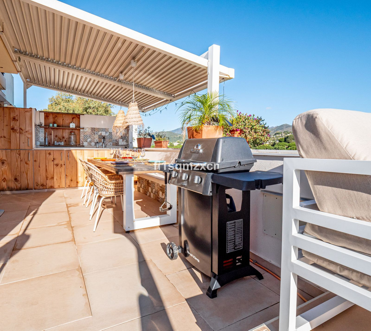The L-shaped roof terrace is a delight to relax on. It features an outdoor kitchen with an induction cooktop, refrigerator, and a second dishwasher. The washing machine and dryer are also installed here. Pergola. On the slightly elevated platform, an L-shaped lounge sofa has been created, offering endless opportunities to enjoy the stunning views. You can see the dolphins jumping right in front of you...