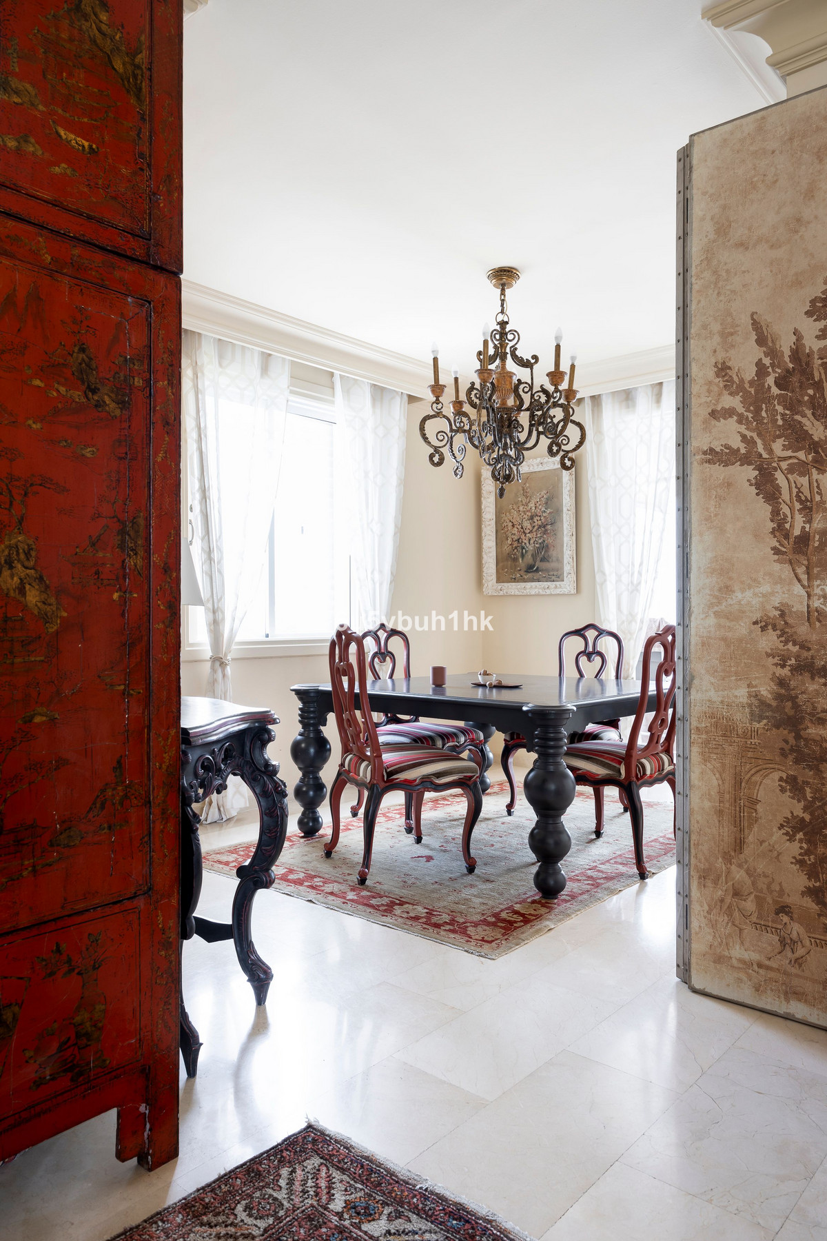 A refined dining area leads to a second terrace overlooking the immaculately landscaped gardens of the urbanization. The property also boasts a large independent fully fitted kitchen, with space for an informal dining area and a dedicated laundry area. Elegant marble flooring throughout the entire property adds a timeless sense of sophistication and continuity to the interior spaces.