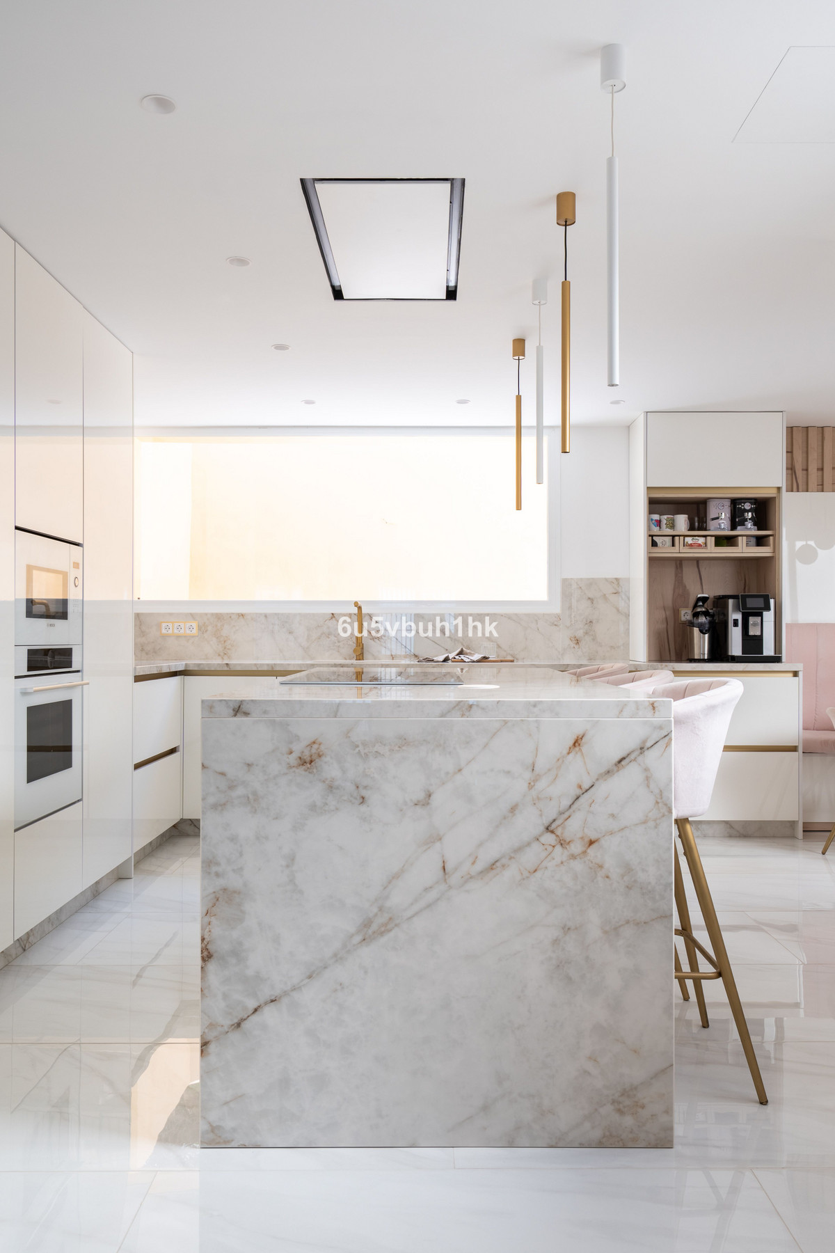 On the main floor (98 m² built), the property is accessed via a charming private patio leading into an entrance hall. To the right, there is a fully equipped open-plan kitchen with a central island, a bespoke designer dining area, and a spacious, light-filled living room with direct access to a sunny terrace, perfect for outdoor breakfasts or sunset dinners. To the left, a modern staircase with futuristic lighting connects the lower levels, along with a guest toilet.