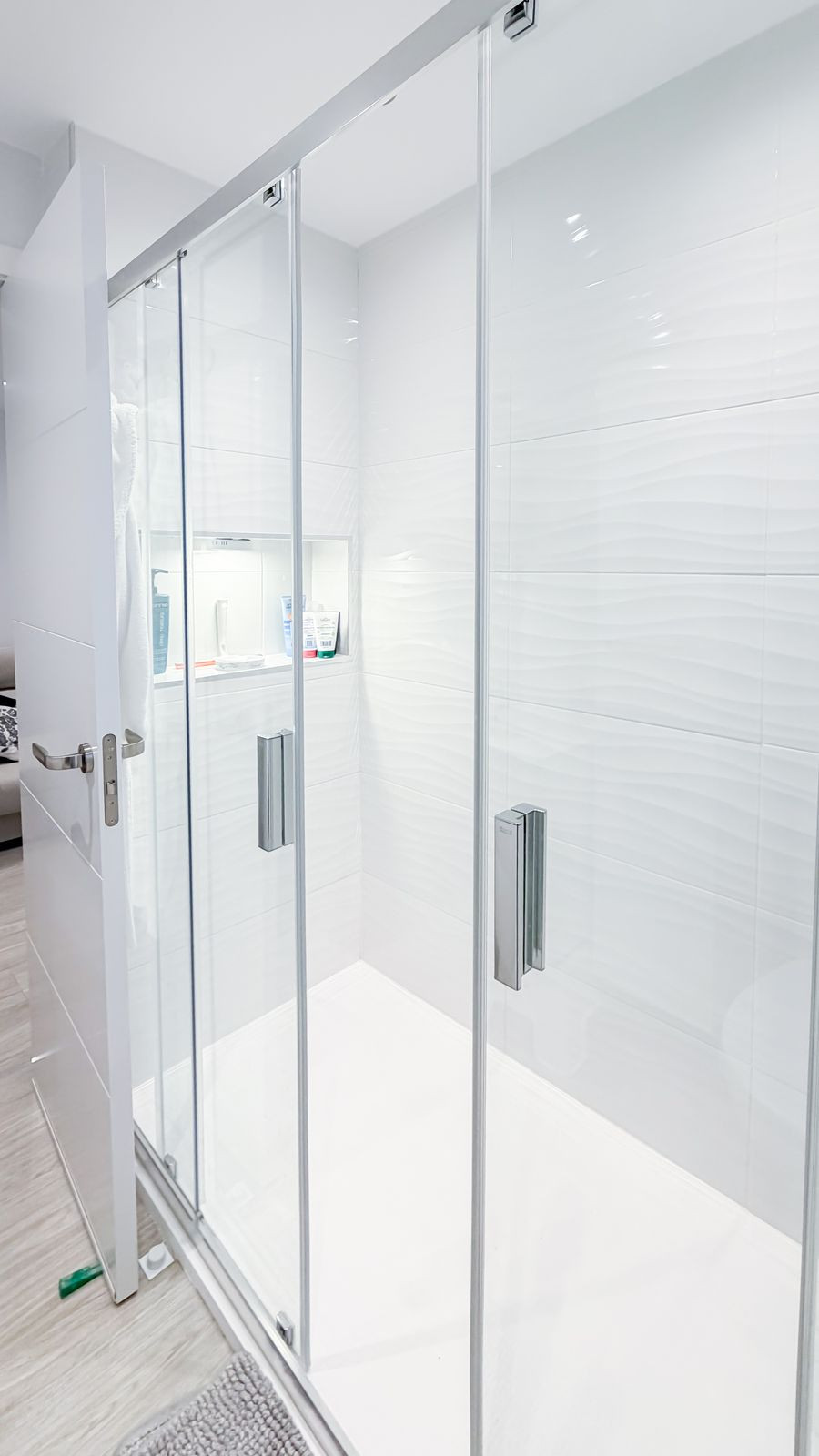 On the lower level, the villa offers a large, bright living and dining area with direct access to the back garden and swimming pool terrace, creating a seamless indoor–outdoor flow. From the living space, there is also access to a separate terrace enclosed with glass curtains, ideal for year-round use. This level also features two spacious bedrooms and two bathrooms (one en-suite). Kitchen with laundry room