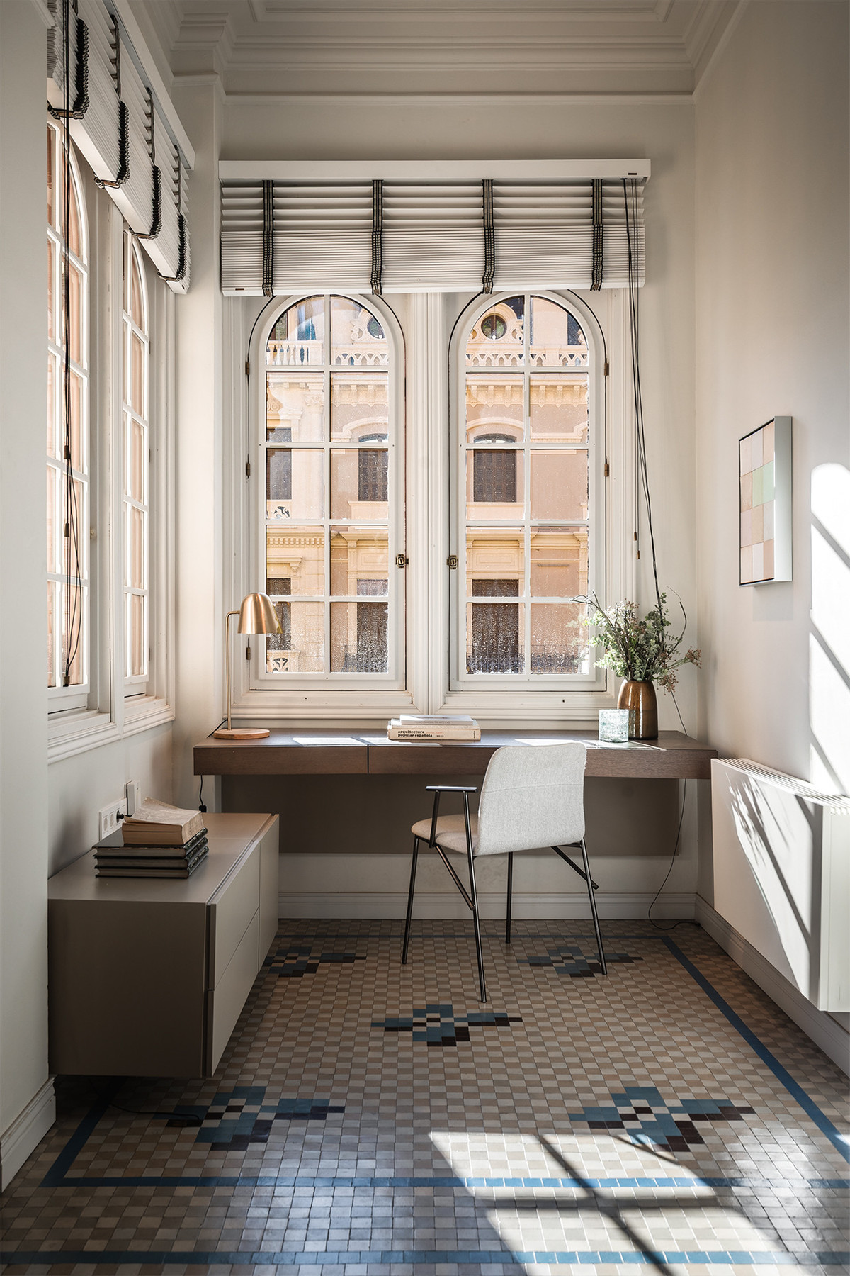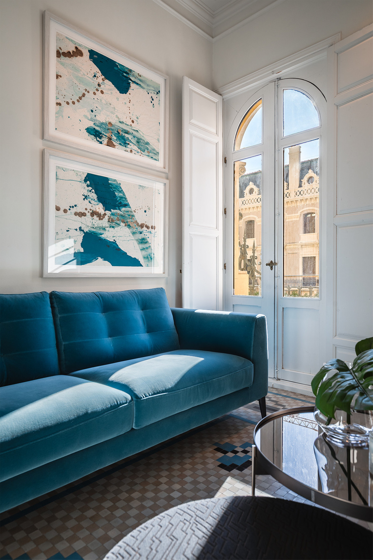 Les matériaux et les finitions témoignent d'une harmonieuse alliance entre tradition et confort contemporain. Les murs sont revêtus d'un enduit à la chaux artisanal, de microciment et d'une peinture écologique Farrow & Ball. Le sol en mosaïque Nolla d'origine, méticuleusement restauré, est conservé dans la majeure partie de la propriété, lui conférant cachet et harmonie esthétique. Les portes et fenêtres de 1922 ont été restaurées, en préservant les boiseries d'origine et en modernisant les ferrures et les mécanismes pour une fonctionnalité optimale.