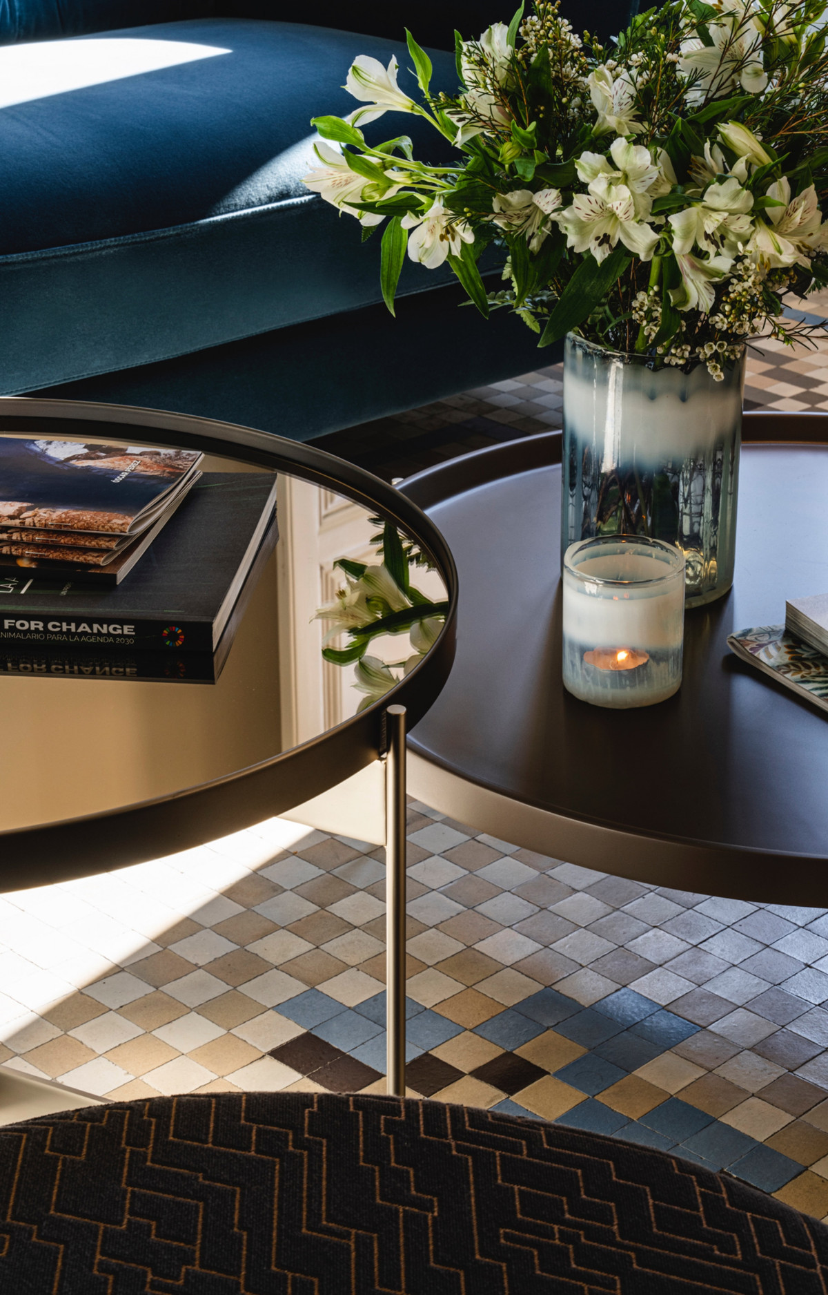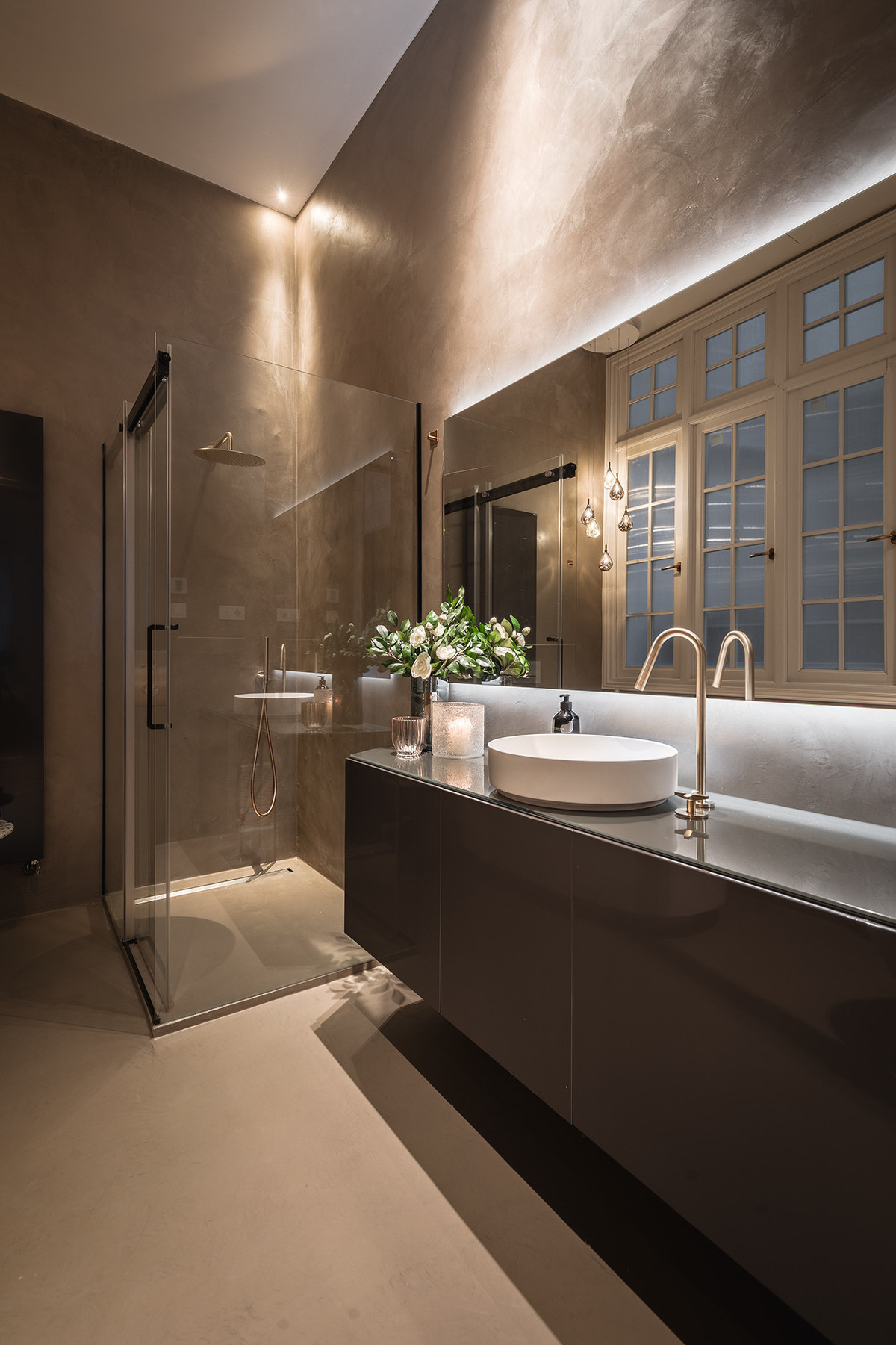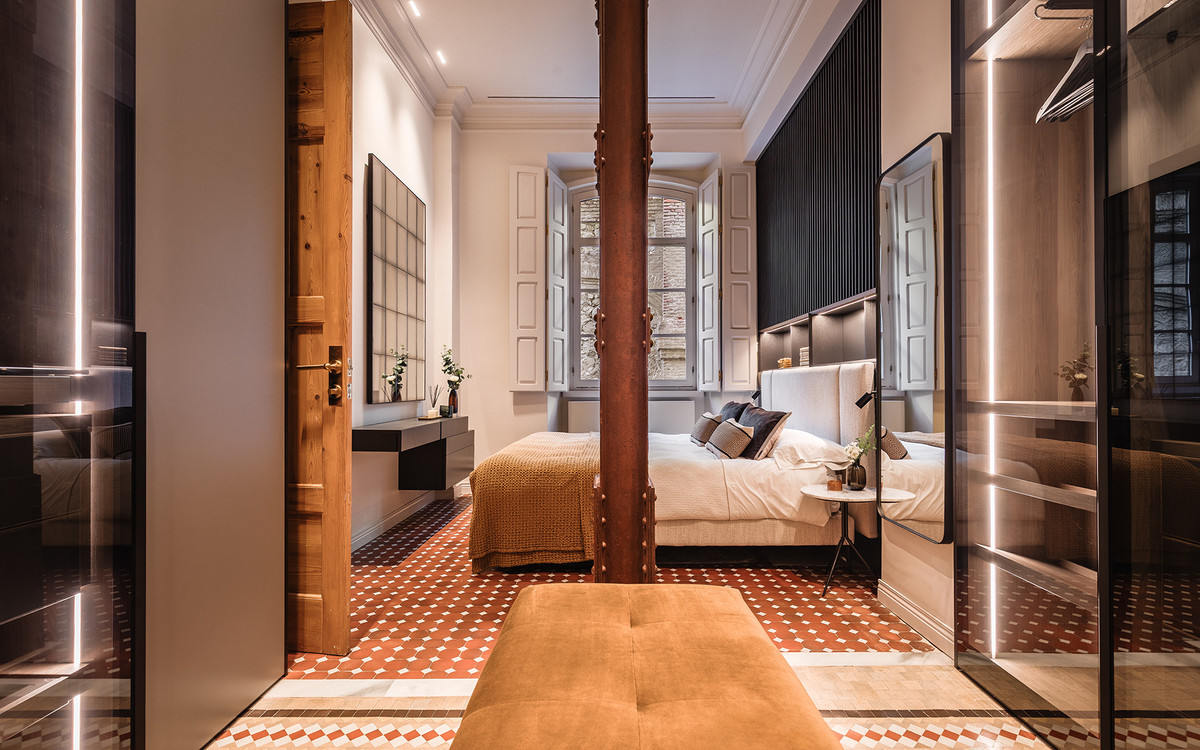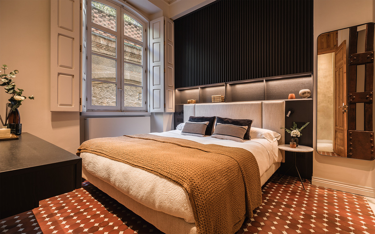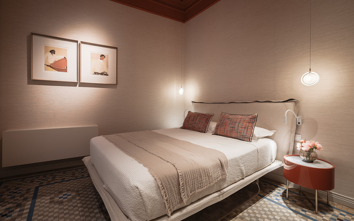 Les salles de bains sont agrémentées de pièces signées Villeroy & Boch et de robinetterie en or brossé de Toro Bath, associées à un mobilier aux lignes sobres d'Inbani. L'éclairage, conçu par Eflux, met discrètement en valeur l'architecture, tandis que le mobilier de Pianca, les tissus de Casamance et les luminaires en verre soufflé de Bomma complètent un ensemble qui allie histoire, design et confort avec équilibre et naturel.