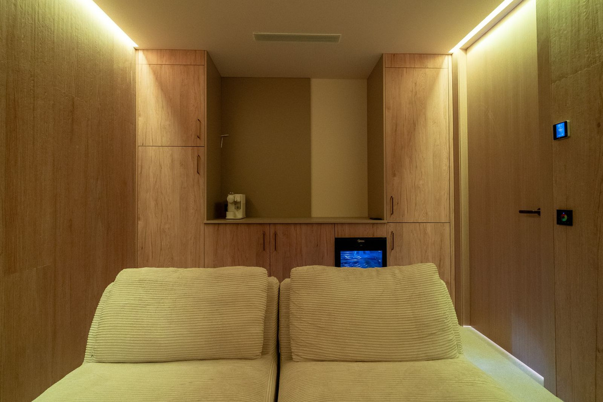 L'étage inférieur comprend un second salon donnant sur l'extérieur, trois chambres, deux salles de bains, une salle de cinéma, un sauna, un hammam et une salle de sport. Tous les étages sont desservis par un ascenseur vitré (à installer).