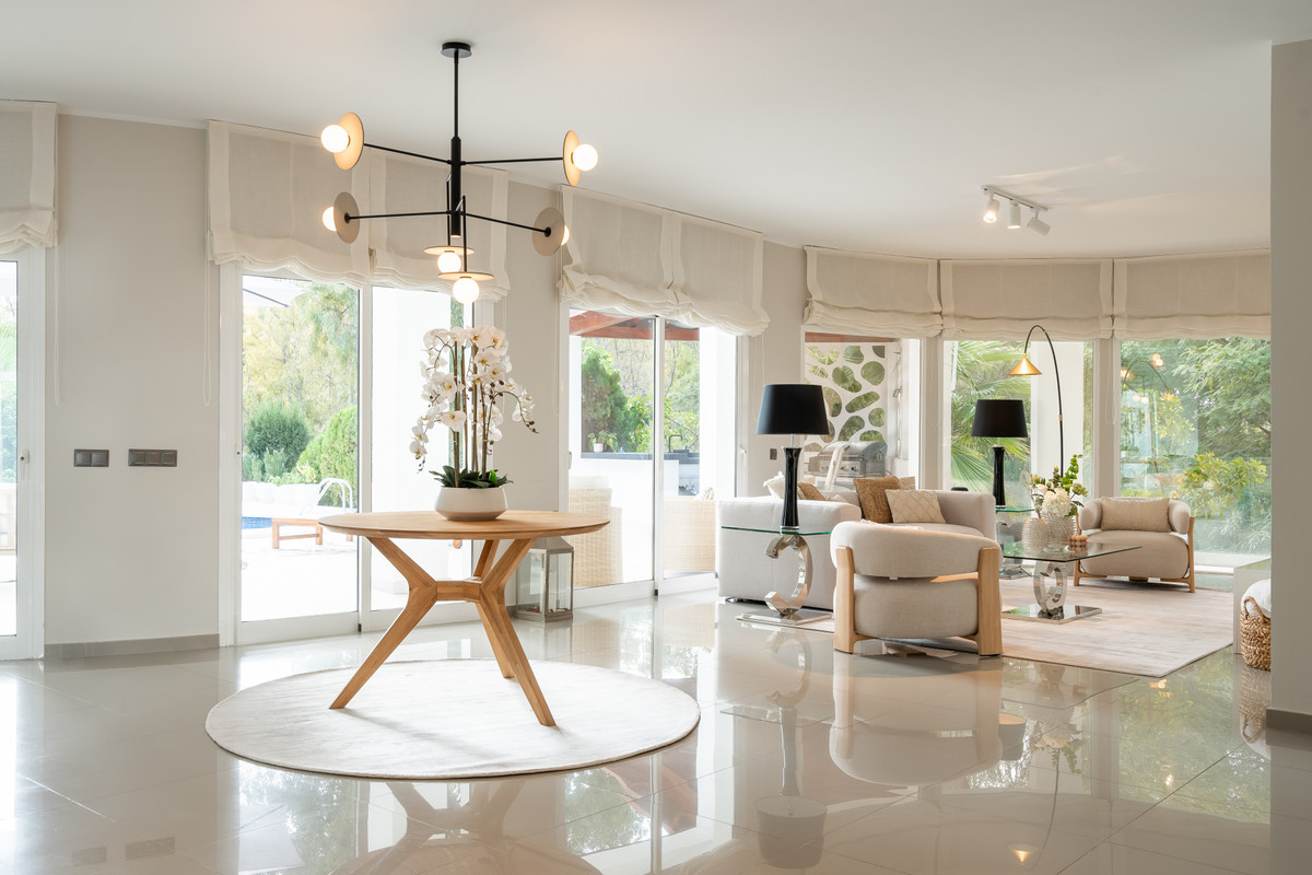 La villa offre de vastes espaces de vie décloisonnés baignés de lumière naturelle, avec une transition harmonieuse vers d'impressionnants espaces extérieurs. Une piscine privée, un jardin paysager et de multiples terrasses créent un cadre idéal pour profiter du climat de la Costa del Sol et des vues panoramiques.