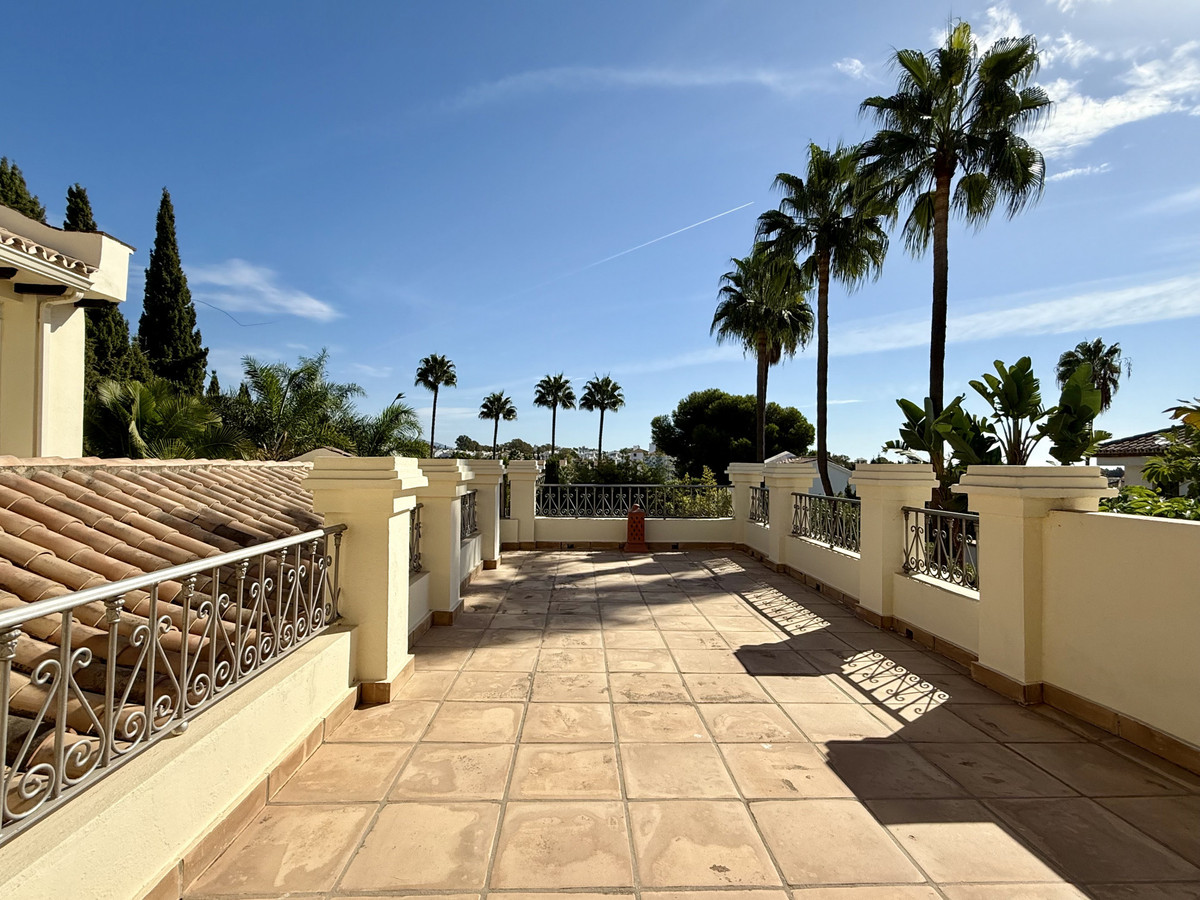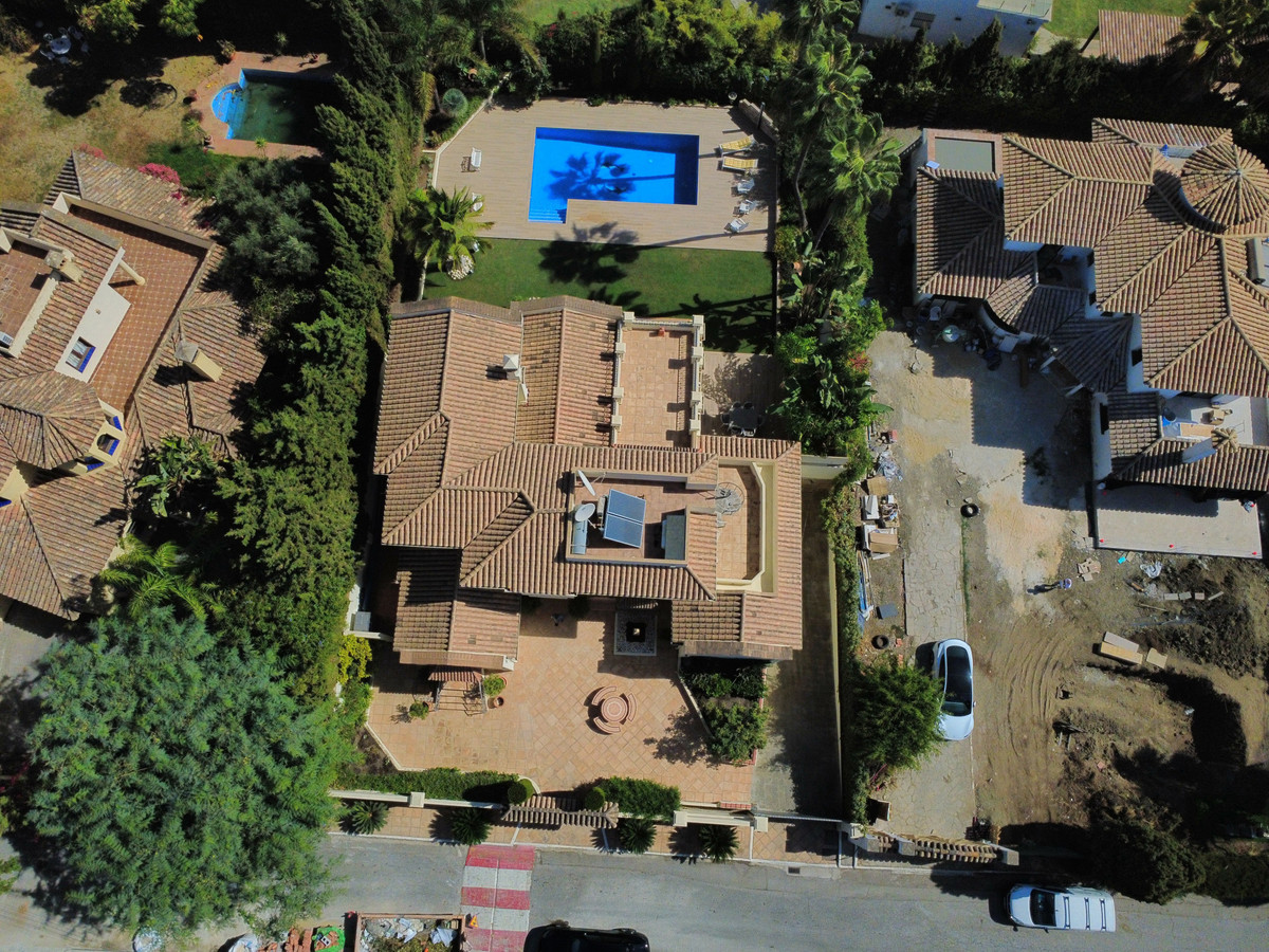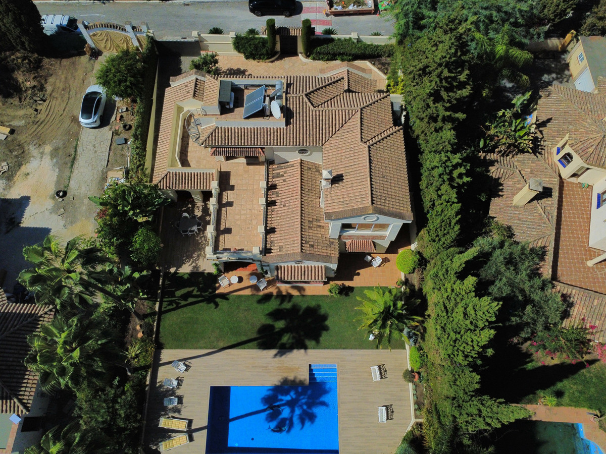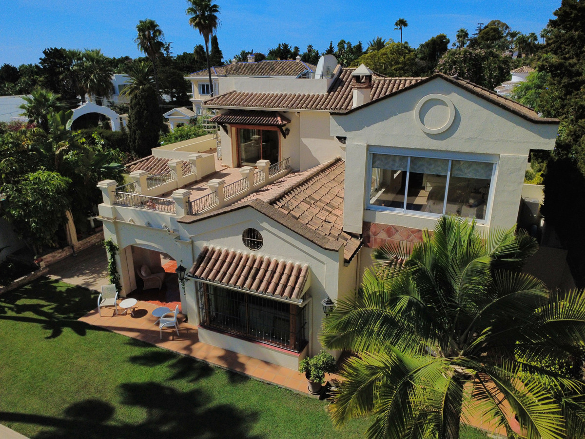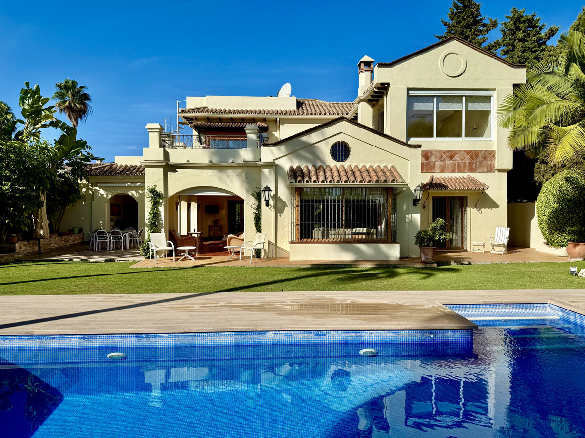 This great property has just come to the market at a very competitive price. It's an Ideal location, walking distance to several commercial centers make it very desirable for those who don't want to take the car to enjoy facilities and restaurants, supermarket, pharmacy, gym or a nice coffee shop. The property is in a lovely condition. The villa has a nice elegant andalusian style. The entrance hall connect to the right with the separate dining room, the fully fitted kitchen ad the large covered and uncovered terrace to the landscaped mature and very private garden and pool. The spacious living room has a high ceiling with wooden beams. On the same level we find two bedrooms with en suite bathroom. A nice stair case bring us up tot he first floor where we find a large and very bright bedroom and the master bedroom with , ensuite bathroom and access to a large very sunny uncovered terrace with lovely mountain views. Going down to the basement we find a games room, a hobby room with bathroom and the very large garage for several cars. Also the utility room. This great family property enjoys a fantastic mature garden and a lovely entrance area. International schools like Atalaya, San José in Guadalmina are just nearby. Proximity to all facilities as several golf courses like El Paraiso, Atalaya or los Flamingos, the beach at 15 minutes walk, The lovely El Campanario sport club with fantastic indoor pool, gym, spa and much more make this a unique family home. A visit is highly recommended.