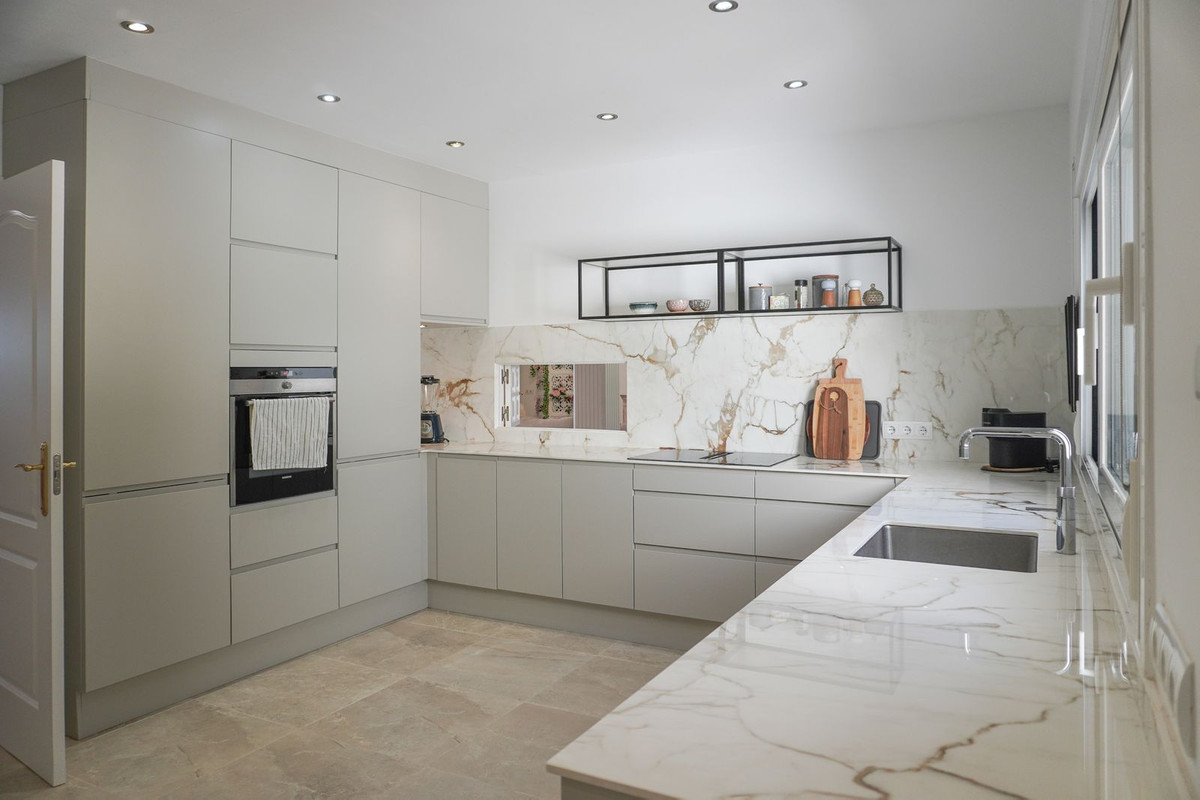 La cuisine a été entièrement rénovée il y a trois ans et est équipée de meubles Designa Kitchen de style nordique, avec des placards et des tiroirs élégants alliant fonctionnalité et confort. Elle comprend également des appareils électroménagers neufs, dont un réfrigérateur combiné extra-large, une plaque de cuisson vitrocéramique avec hotte intégrée, un nouveau revêtement de sol et un système Quooker fournissant de l'eau bouillante instantanément.