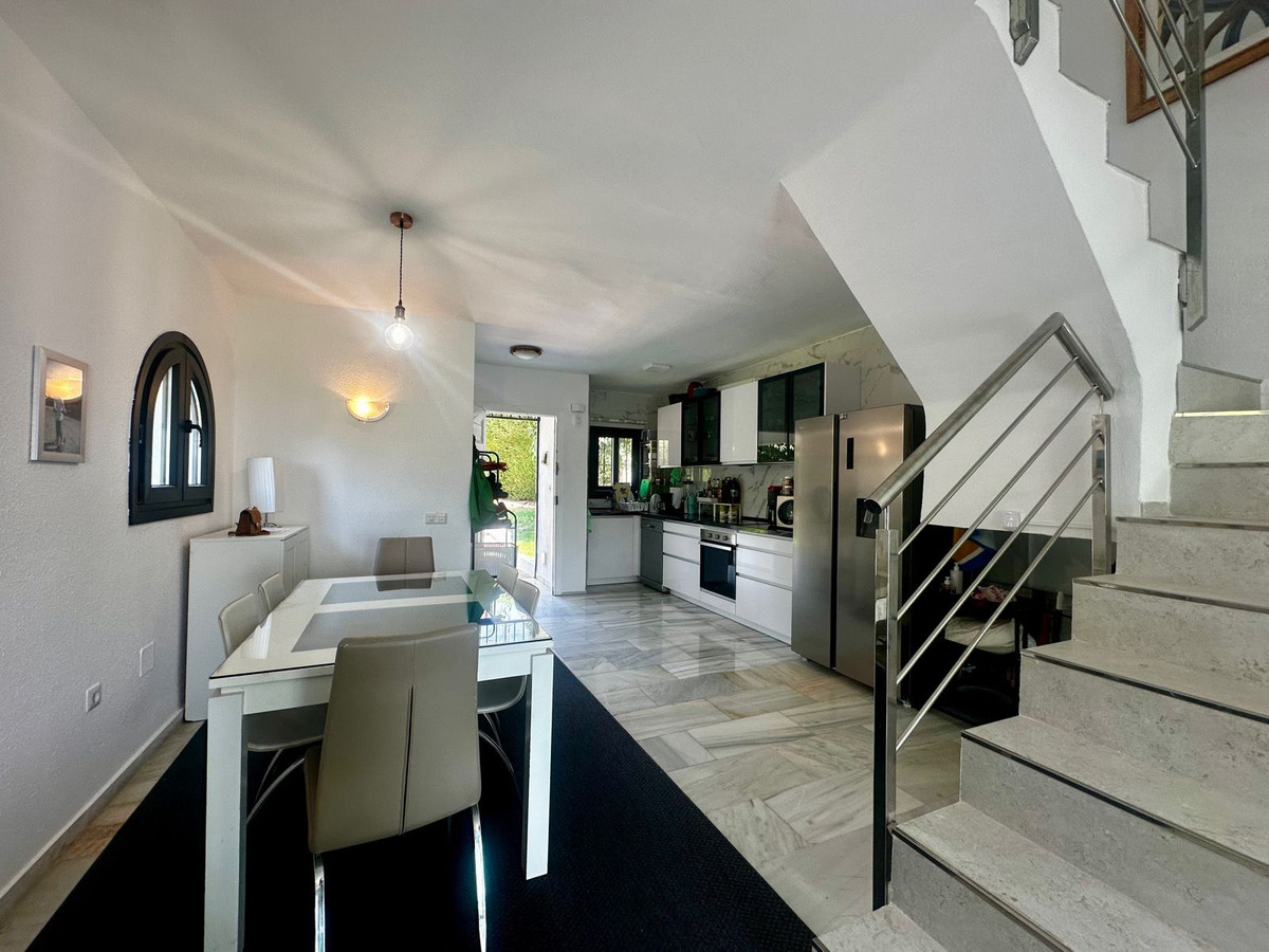 Charmante maison jumelée à Calahonda, située en première ligne d'un terrain de golf dans un quartier résidentiel calme avec piscine commune et jardins magnifiquement entretenus.