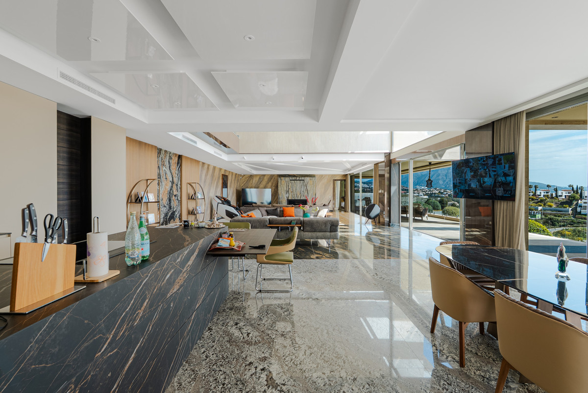 Située sur un terrain surélevé et privé dans l'un des quartiers résidentiels les plus prisés de Benahavís, cette villa contemporaine d'exception offre une vue panoramique imprenable sur la mer Méditerranée, la vallée du golf et les montagnes environnantes.