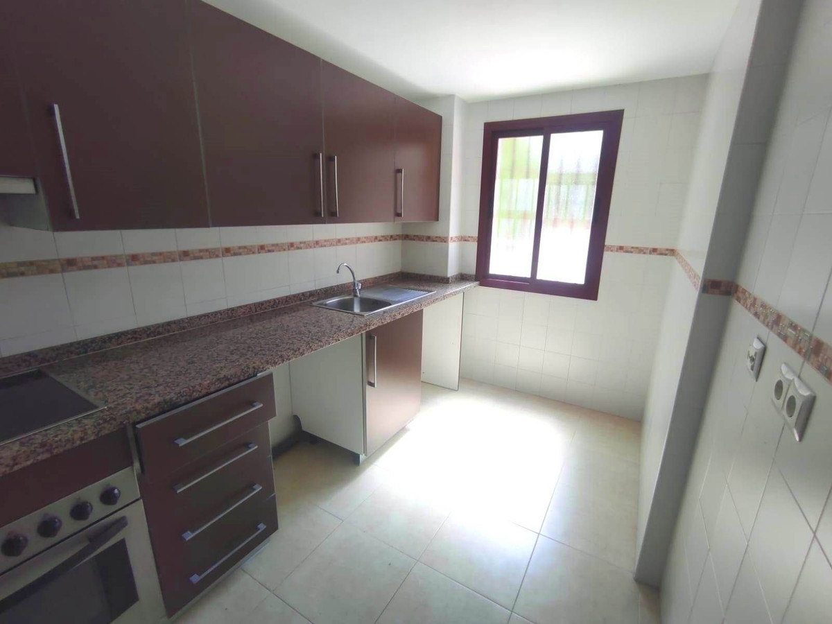 La cuisine est équipée de placards hauts et bas et comprend une plaque de cuisson vitrocéramique, un four et une hotte aspirante. L'appartement dispose également de placards intégrés, d'une place de parking et d'un accès à de vastes espaces communs avec piscine et jardins.