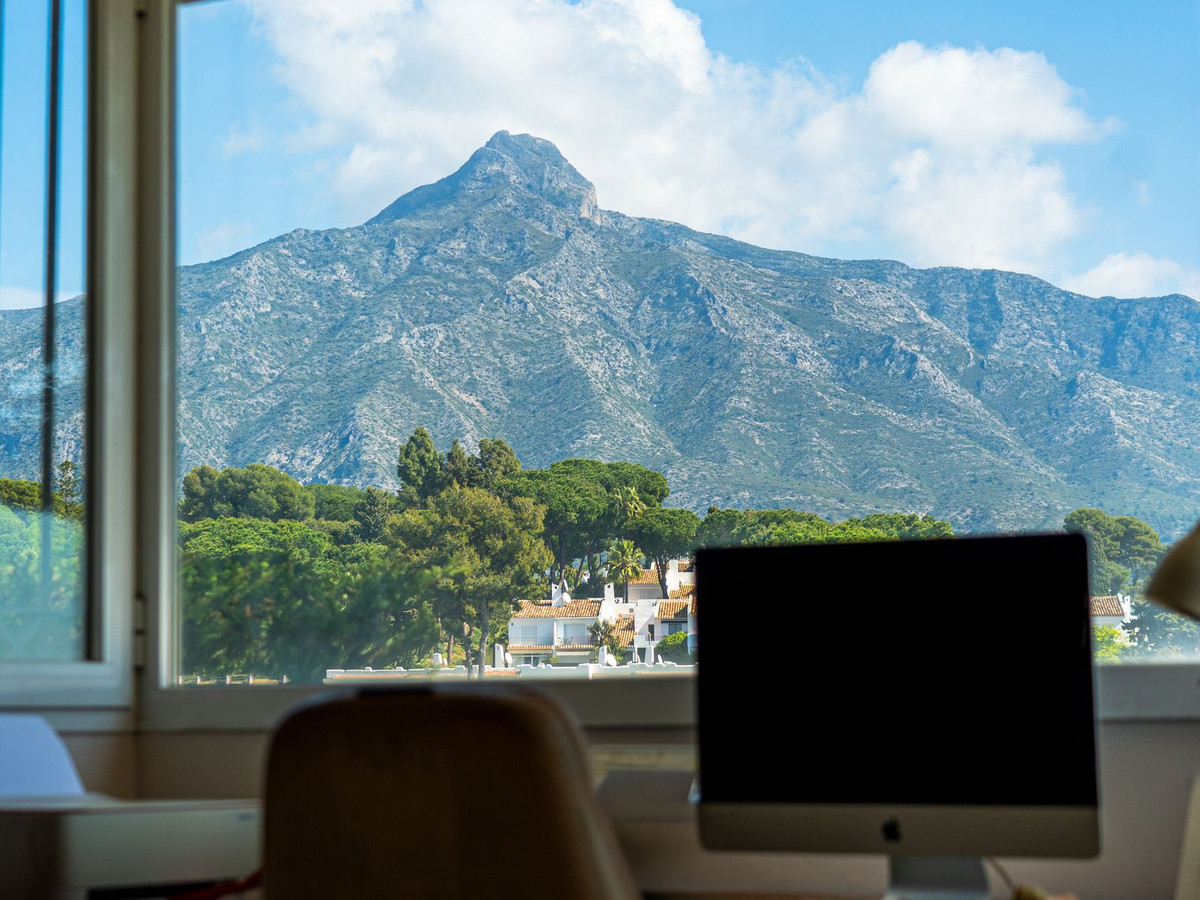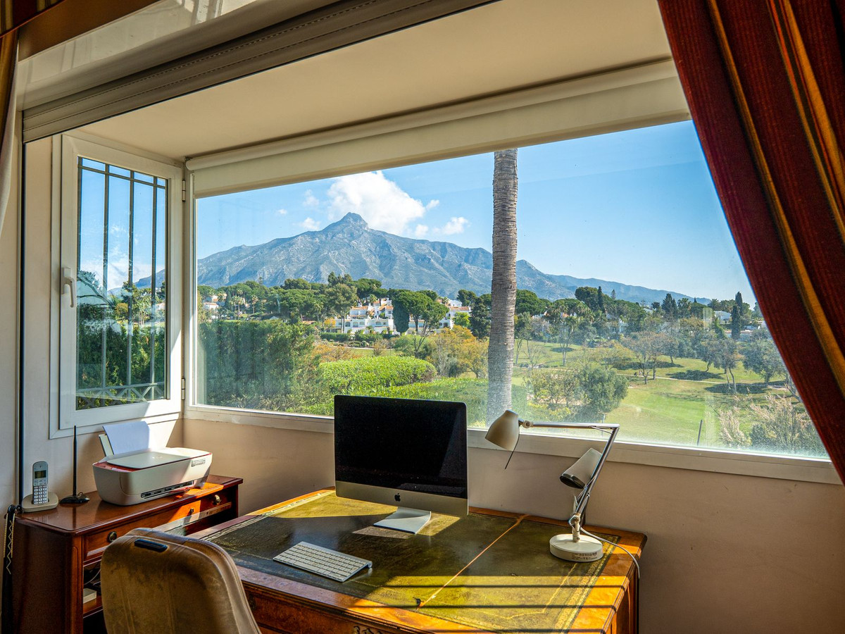 Découvrez une villa andalouse d'exception, idéalement située en première ligne face à l'Aloha Golf Club, offrant une vue panoramique à couper le souffle qui s'étend sur les fairways jusqu'à l'emblématique La Concha.