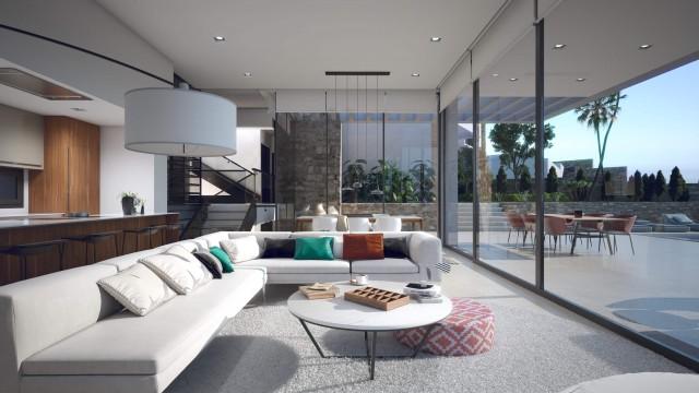 caractéristiques Fenêtres en aluminium, construction de haut standing, Style contemporain, Sol radiant, Plafonds hauts, Vue mer, Fenêtres de sécurité, chauffage radiant.