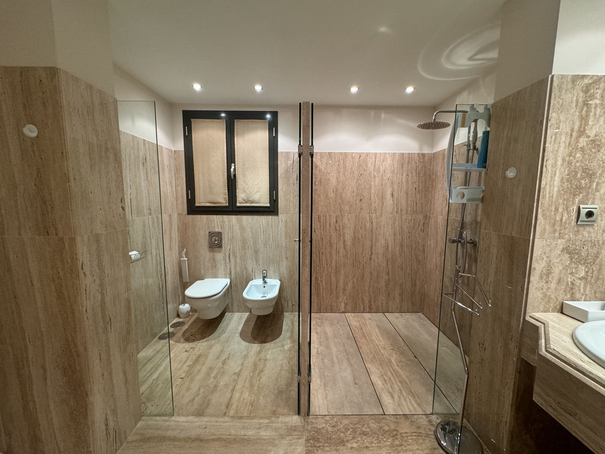 The apartment also features a guest bathroom and a private elevator. It comes with a parking space and a storage room located in the basement, accessible by the private elevator.