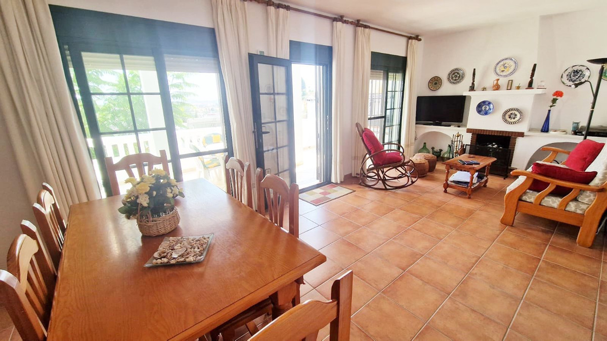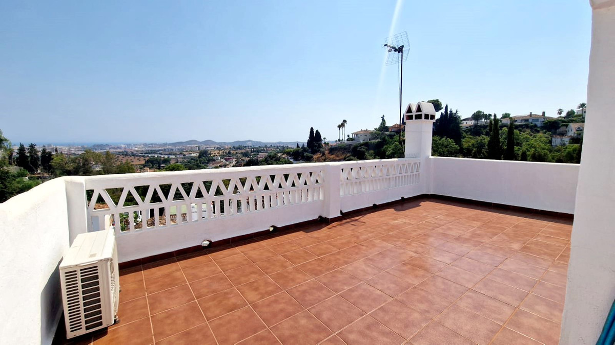 Partially renovated townhouse in Campo Mijas with panoramic views. Spread over 3 floors, it features 3 bedrooms, terraces on every level, a solarium, modern kitchen, and BBQ terrace. Community pool & gardens included. Peaceful location just 5 minutes from town!