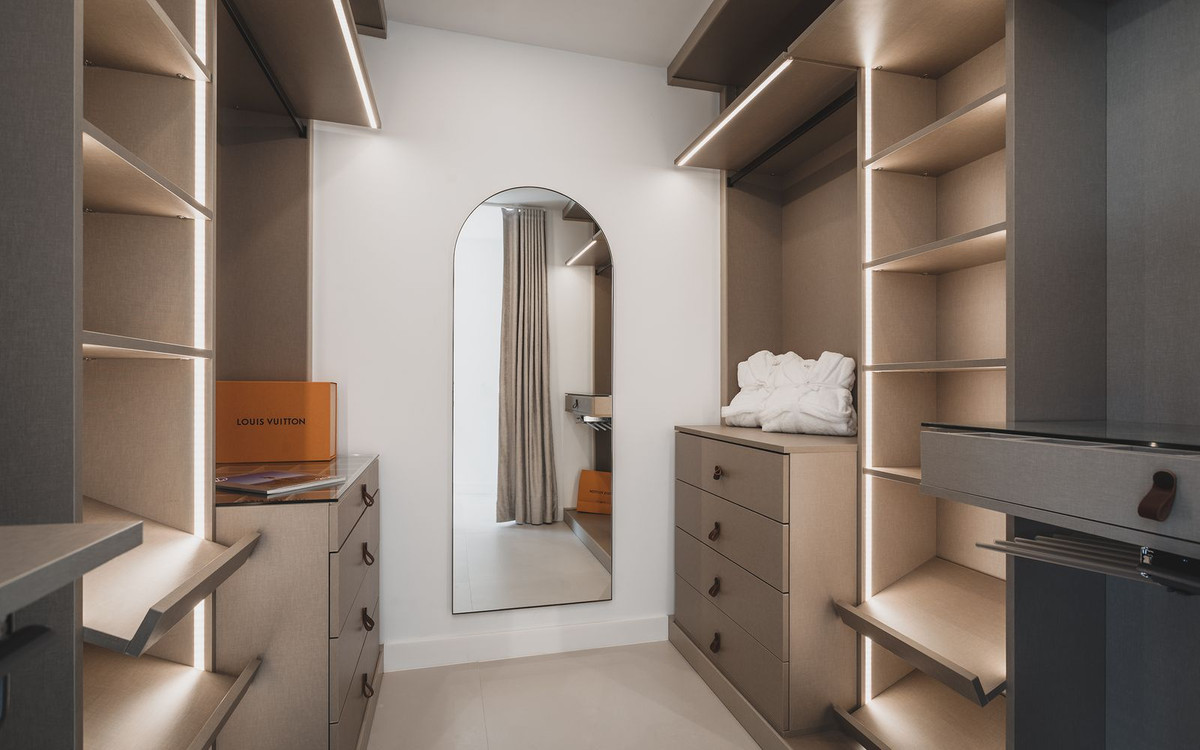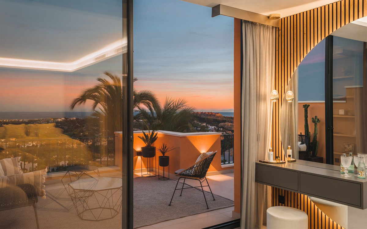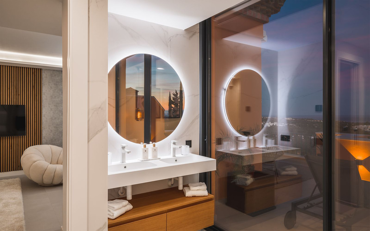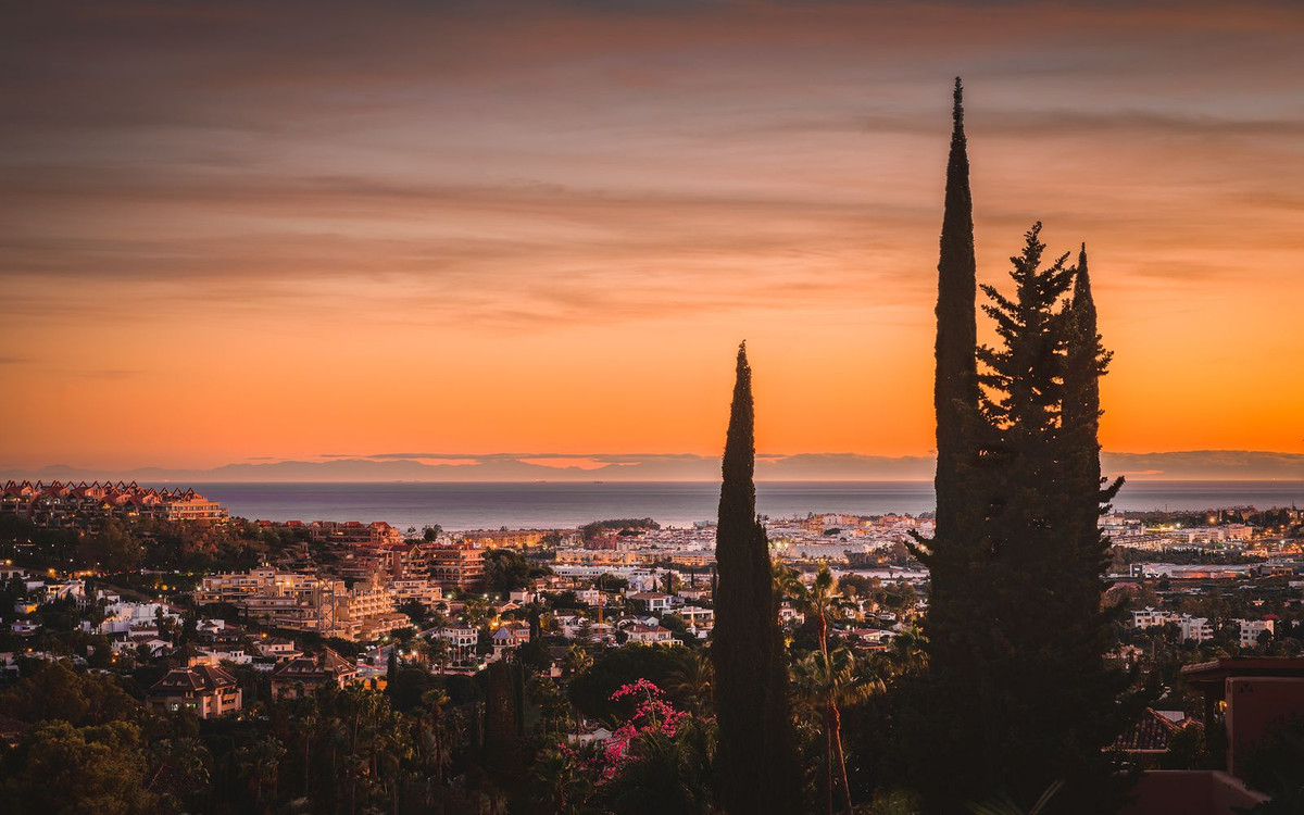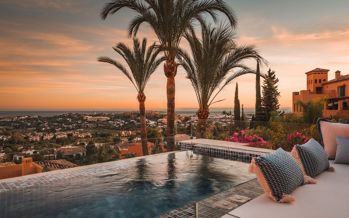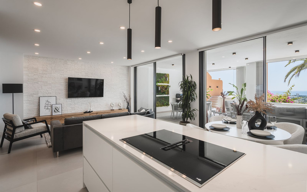 Spectaculaire penthouse en duplex entièrement rénové avec vue panoramique imprenable sur la mer, les montagnes et la vallée du golf à Los Belvederes, une résidence fermée réputée de La Cerquilla, Nueva Andalucia, avec sécurité 24h/24, jardins communs arborés, piscine, 2 courts de tennis (actuellement en discussion pour convertir l'un d'eux en 2 courts de paddle) et une salle de sport avec sauna. La propriété occupe tout le dernier étage de l'immeuble et comprend une impressionnante entrée avec vestiaire et petite cave à vin, menant au salon/salle à manger avec vue panoramique sur la mer et accès à une terrasse couverte menant à une terrasse découverte avec bassin profond/jacuzzi ; une cuisine ouverte avec appareils électroménagers Neff haut de gamme ; et une chambre d'amis avec salle de bain attenante et dressing. À l'étage : une chambre principale double avec salle de bain attenante, cheminée, dressing et accès à une terrasse découverte avec stores électriques, bénéficiant des meilleures vues ; une chambre d'amis avec salle de bain attenante ; et une buanderie. Les autres caractéristiques comprennent : la technologie aérothermique Daikin ; Chauffage au sol (eau chaude) dans toute la maison ; système audio Sono dans toute la maison ; climatisation réversible avec régulateurs de zone. La propriété comprend une place de parking et