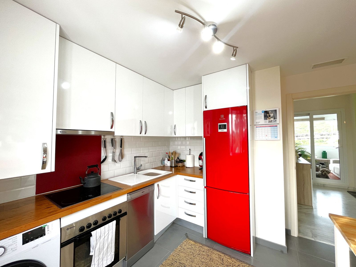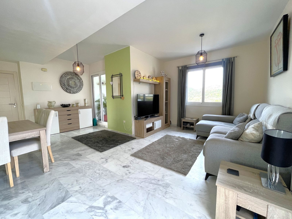 La propriété se distingue par sa grande terrasse panoramique offrant une vue imprenable sur le golf et les montagnes, l'endroit idéal pour profiter du soleil et de la tranquillité. Dès l'entrée, vous découvrirez un salon-salle à manger lumineux et spacieux donnant sur une terrasse vitrée avec rideaux coulissants, idéale comme espace de vie supplémentaire. La cuisine entièrement rénovée et équipée offre des finitions haut de gamme.