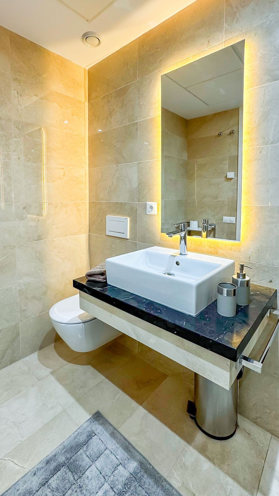 À l'intérieur, les deux salles de bains bénéficient de finitions haut de gamme avec chauffage au sol, tandis que la cuisine est entièrement équipée d'électroménagers haut de gamme. L'appartement regorge de détails soignés : stores électriques, finitions en bois et pierre de qualité supérieure, et matériaux muraux soigneusement choisis pour un confort optimal et une acoustique optimale. Une buanderie séparée ajoute une touche pratique.