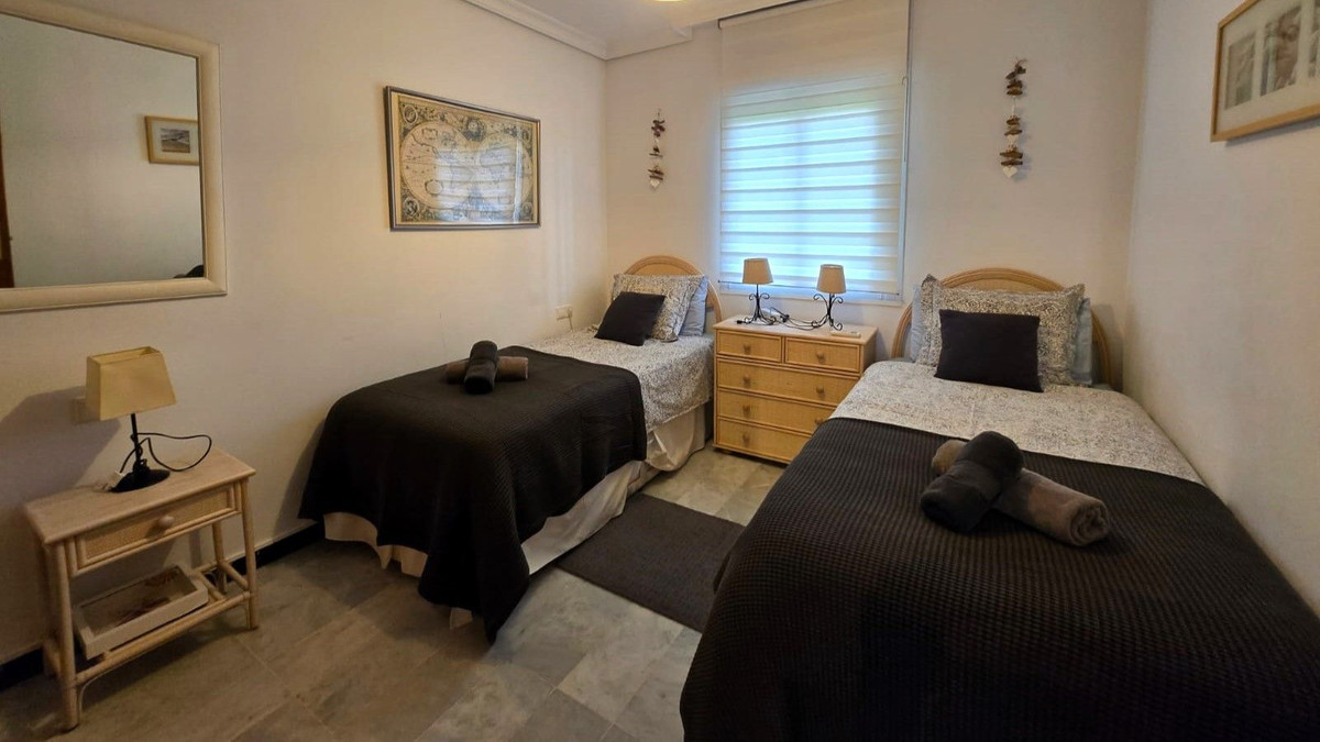 Située dans une résidence calme et sécurisée, la propriété offre des jardins magnifiquement entretenus et une piscine commune. Elle est idéalement située à quelques pas de nombreuses commodités, dont des supermarchés, des bars et des restaurants.