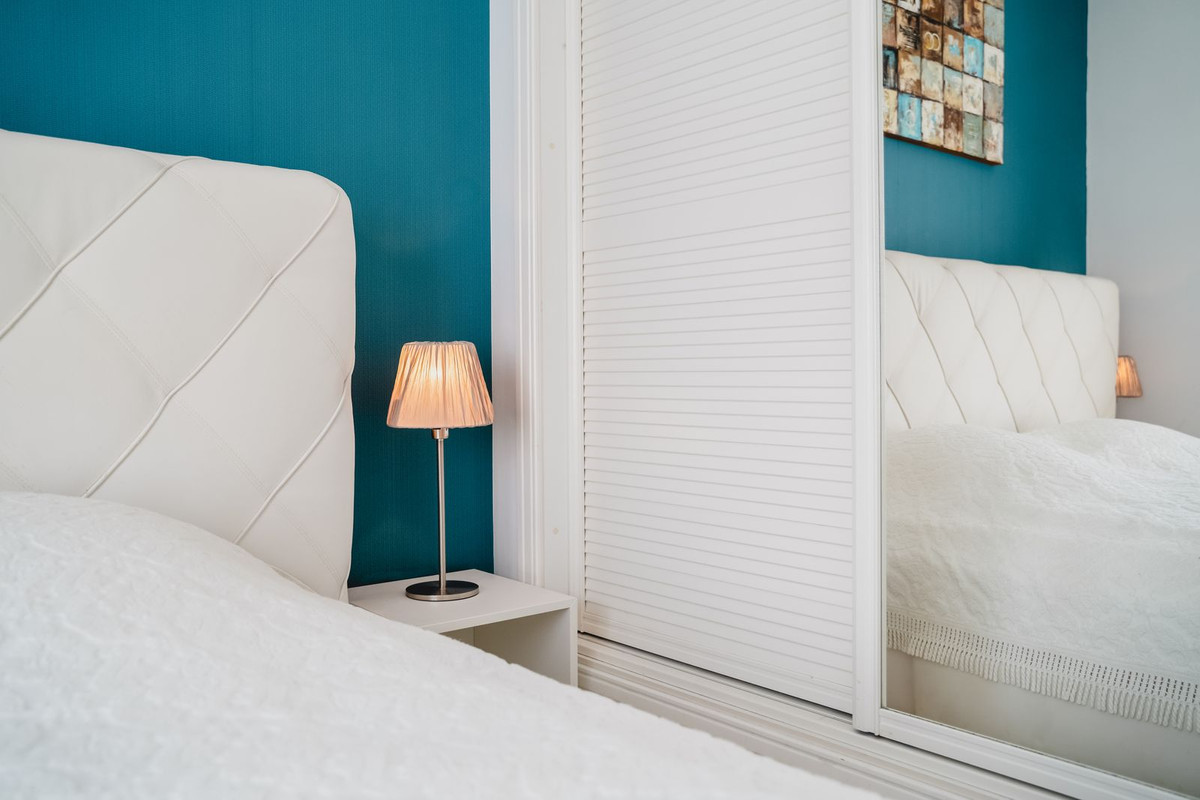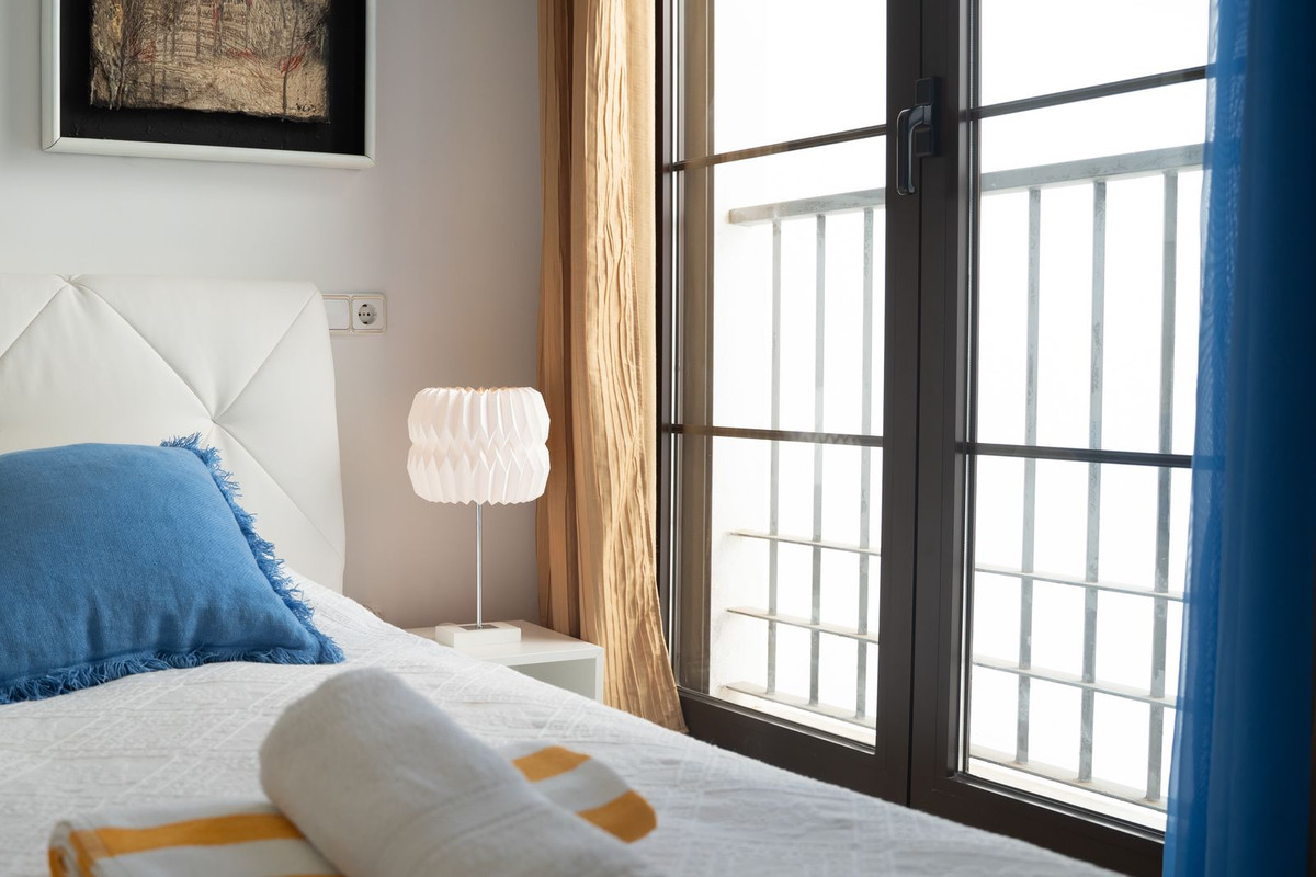 Enfin, la chambre principale avec salle de bain attenante et accès à un balcon français.